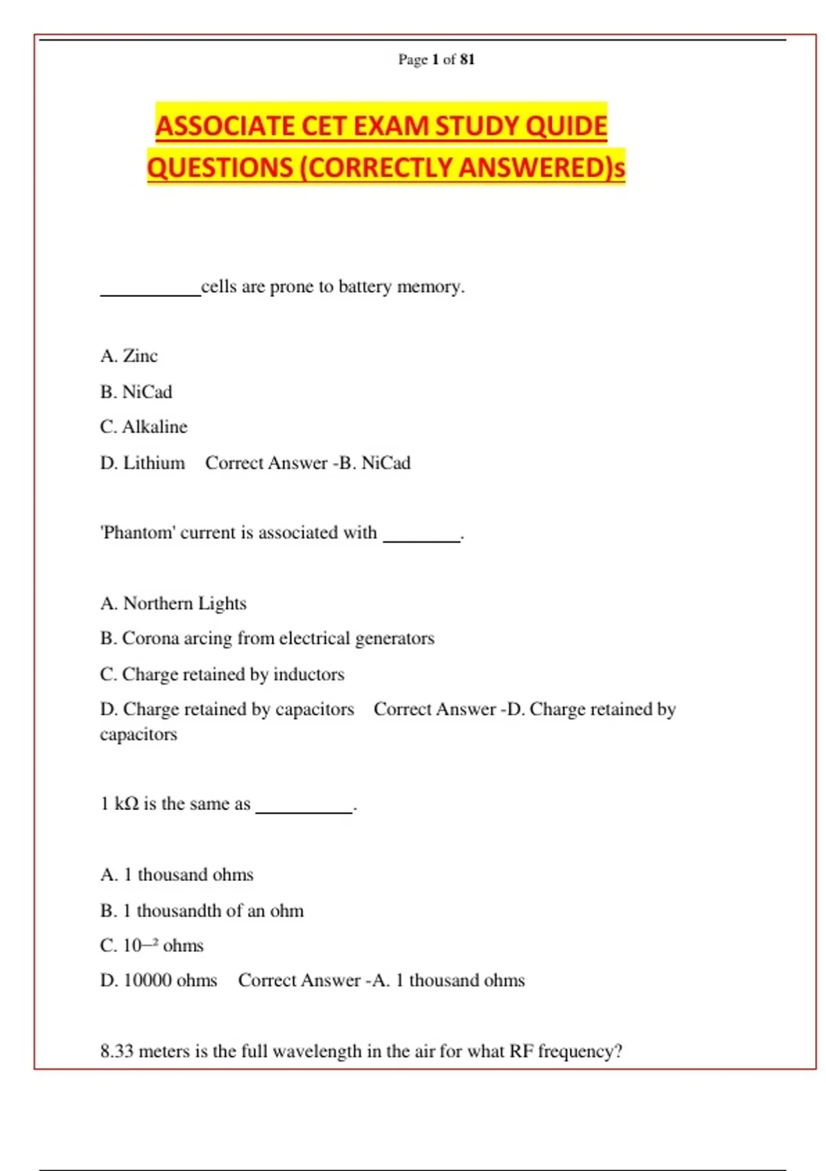This comprehensive study guide contains over 80 pages of correctly answered multiple-choice questions tailored for the Associate Certified Electronics Technician (CET) exam. It covers essential topics such as circuit theory, digital and analog electronics, RF communication, troubleshooting techniques, and component identification. Ideal for students, technicians, and professionals preparing for CET certification, this resource ensures mastery of foundational concepts and practical applications. Instant download available. Perfect for LMS bundles, exam prep platforms, and technical training programs. #CETExam #ElectronicsTechnician #StudyGuide #TechnicalCertification #ElectricalEngineering #RFSystems #DigitalCircuits #AnalogCircuits #Troubleshooting #InstantDownload #ExamPrep #LMSReady