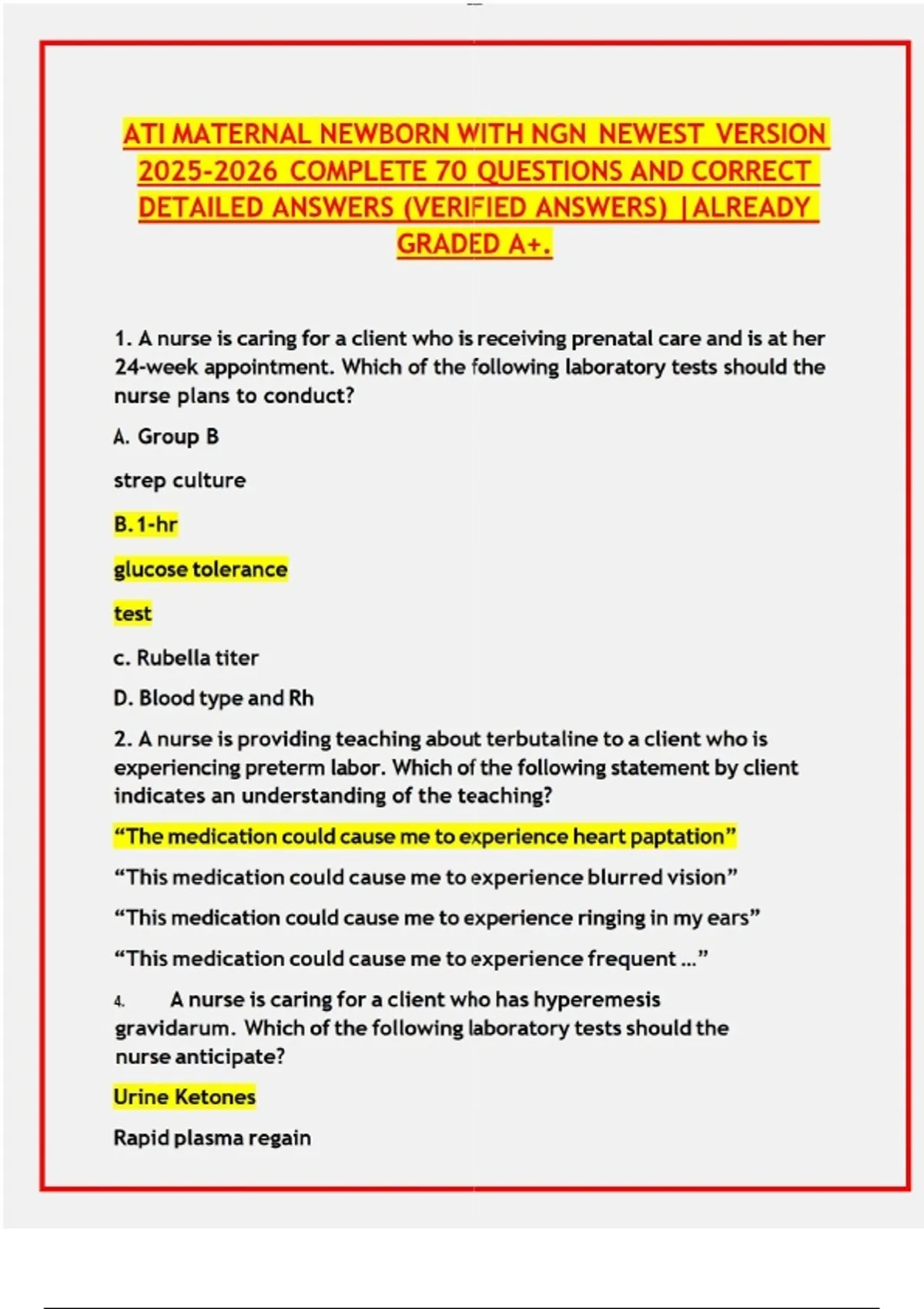 ATI MATERNAL NEWBORN WITH NGN NEWEST VERSION COMPLETE 70 QUESTIONS AND CORRECT DETAILED ANSWERS (VERIFIED ANSWERS) ALREADY GRADED A+