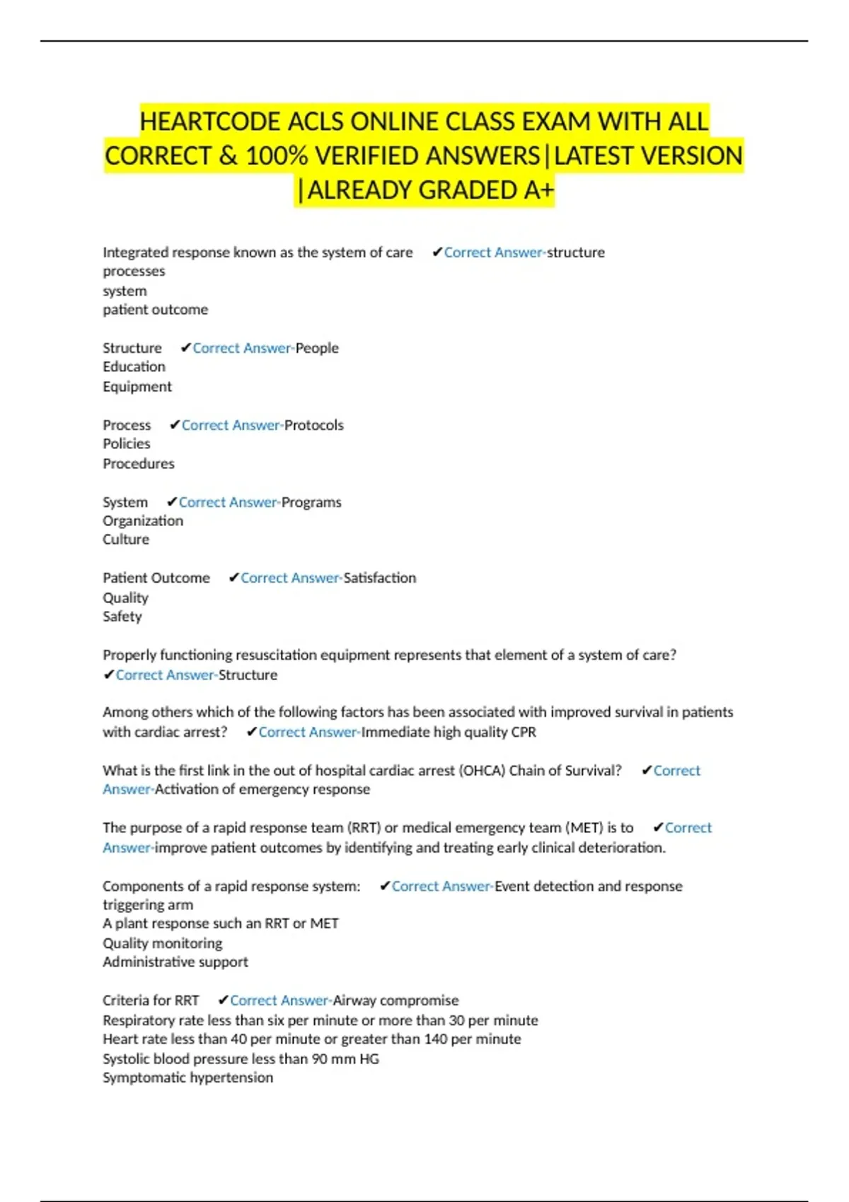 Benefits of implementing a rapid response system ✔Correct Answer-Decreased in hospital cardiac