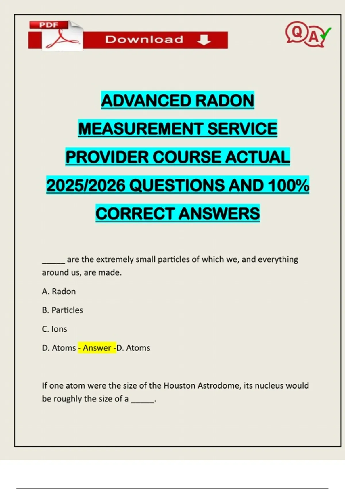 ADVANCED RADON MEASUREMENT SERVICE PROVIDER COURSE ACTUAL 2025/2026 QUESTIONS AND 100% CORRECT ANSWERS _____ are the extremely small particles of which we, and everything around us, are made. A. Radon B. Particles C. Ions D. Atoms - Answer -D. Atoms If one atom were the size of the Houston Astrodome, its nucleus would be roughly the size of a _____.Need assistance on Online classes, Exams & Assignments? Reach out for instant help!! Full Course Assistance, Plagiarism-free Essay Writing, Research Paper, Dissertation, Discussion Posts, etc…. Confidential & Secure services. Tutors are available for all subjects! Email now at: A. submarine B. pea C. airplane D. building - Answer -B. pea T/F: The balance of the forces in the nucleus of an atom determines whether a nucleus is stable or unstable (radioactive). A. False B. True - Answer -B. True As an unstable nucleus emits radiation as it disintegrates, the radionuclide transforms to different nuclides, and this process is called _____. A. radioactive development B. radioactive decay C. radon gas mitigation D. radio transmission - Answer -B. radioactive decayA _____ refers to the series of transformations that a given radionuclide will undergo, as well as the kind of radiation it emits, which are characteristic of the radionuclide. A. radon mitigation B. decay chain C. radiation D. radon curies - Answer -B. decay chain Radioactive half-life is the time req