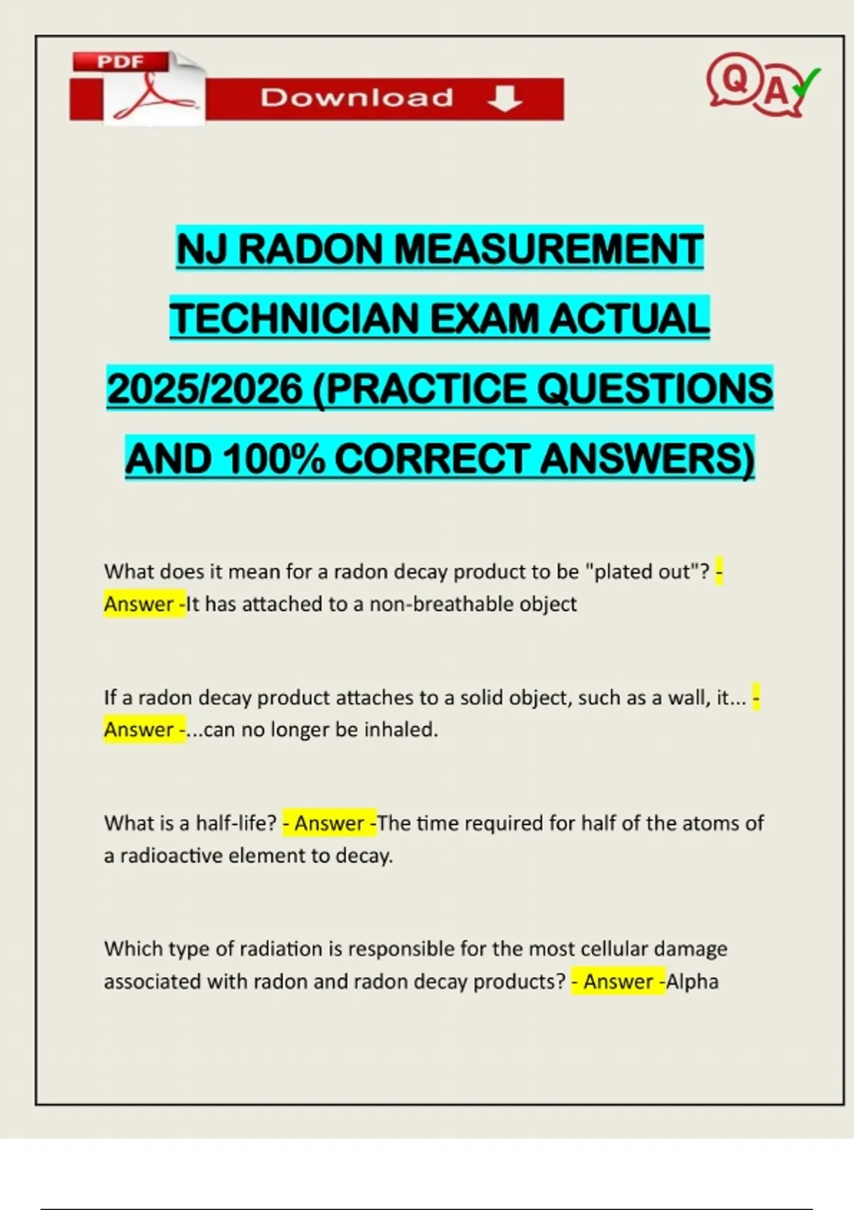 NJ RADON MEASUREMENT TECHNICIAN EXAM ACTUAL 2025/2026 (PRACTICE QUESTIONS AND 100% CORRECT ANSWERS) What does it mean for a radon decay product to be "plated out"? - Answer -It has attached to a non-breathable object If a radon decay product attaches to a solid object, such as a wall, it... - Answer -...can no longer be inhaled. What is a half-life? - Answer -The time required for half of the atoms of a radioactive element to decay. Which type of radiation is responsible for the most cellular damage associated with radon and radon decay products? - Answer -AlphaNeed assistance on Online classes, Exams & Assignments? Reach out for instant help!! Full Course Assistance, Plagiarism-free Essay Writing, Research Paper, Dissertation, Discussion Posts, etc…. Confidential & Secure services. Tutors are available for all subjects! Email now at: The negatively charged subatomic particle that orbits the nucleus is called a(n) - Answer -electron Radon decay products that are not attached to airborne particles are much more likely to... - Answer -deposit radiation into lung tissue if inhaled. The number of protons plus the number of neutrons in a specific atom is called - Answer -Mass number The number of protons in an atom's nucleus is the same as the atom