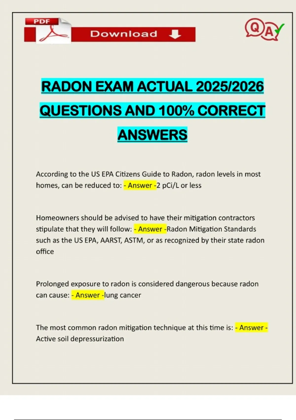 RADON EXAM ACTUAL 2025/2026 QUESTIONS AND 100% CORRECT ANSWERS According to the US EPA Citizens Guide to Radon, radon levels in most homes, can be reduced to: - Answer -2 pCi/L or less Homeowners should be advised to have their mitigation contractors stipulate that they will follow: - Answer -Radon Mitigation Standards such as the US EPA, AARST, ASTM, or as recognized by their state radon office Prolonged exposure to radon is considered dangerous because radon can cause: - Answer -lung cancer The most common radon mitigation technique at this time is: - Answer - Active soil depressurizationNeed assistance on Online classes, Exams & Assignments? Reach out for instant help!! Full Course Assistance, Plagiarism-free Essay Writing, Research Paper, Dissertation, Discussion Posts, etc…. Confidential & Secure services. Tutors are available for all subjects! Email now at: The Radon Action Level in the United States is: - Answer -4.0 pico Curies per liter of air The submembrane mitigation strategy is applicable to which of the following foundation types? - Answer -Crawl space houses What is radon? - Answer -An invisible, odorless, tasteless, naturally occurring, radioactive gas. What is the minimum deployment/sampling period for a short-term test? - Answer -Two days What is the purpose of the US EPA Map of Radon Zones? - Answer -To suggest where radon resistant new construction techniques would be the most cost-effectively employed. Which of the following best represents the recommendation of the U.S. EPA for citizen exposure to radon? - Answer -Long-term exposure to elevated radon can increase the potential for lung cancerWhich of the following is an acceptable location for the discharge of an active soil depressurization system? - Answer -Above the eave of the roof. Which of the following locations is appropriate for the fan of an active soil depressurization system? - Answer -Attic Which of the following Radon
