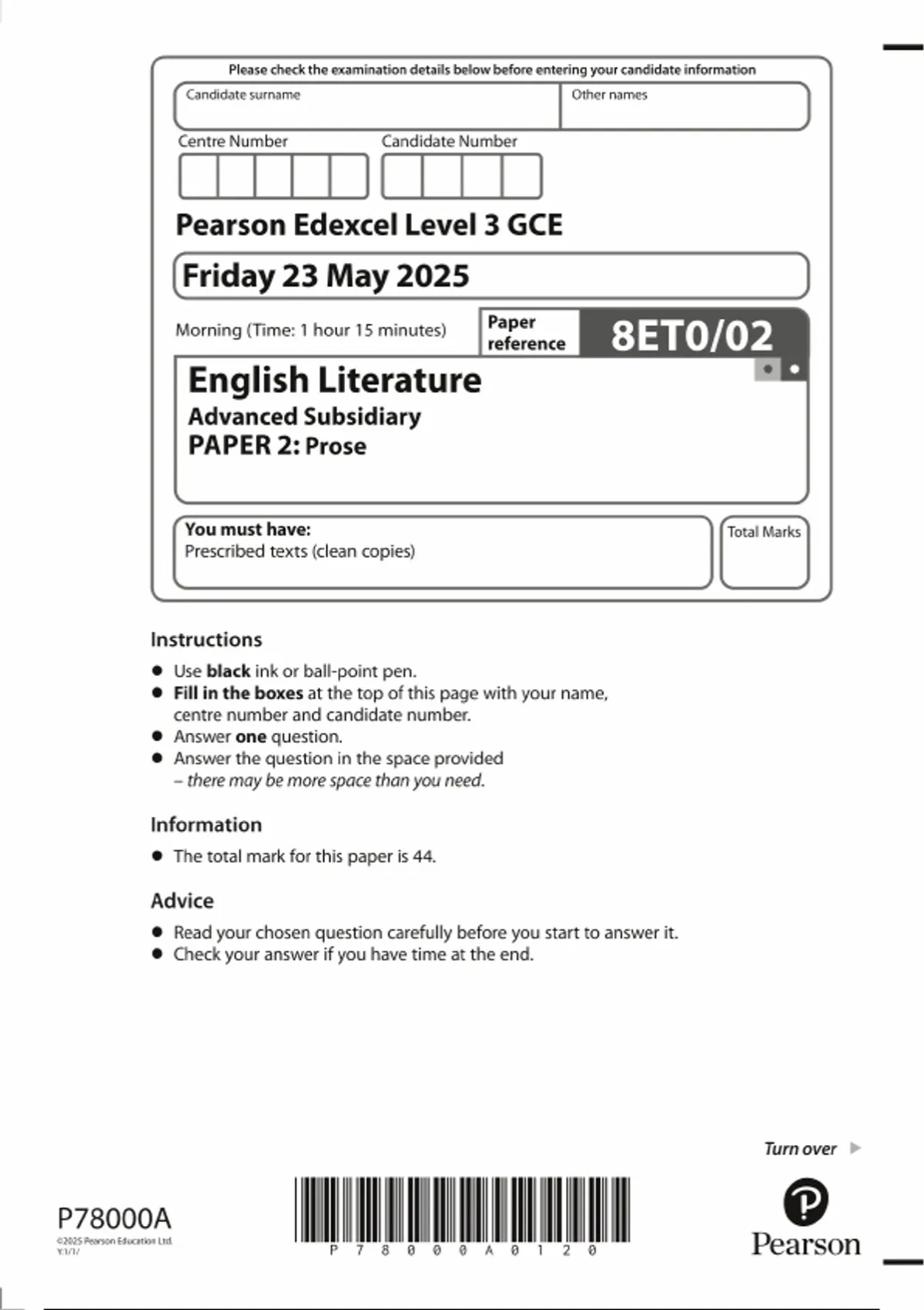 2025 Pearson Edexcel As Level English Literature Paper 2 (8ETO/02: Prose)