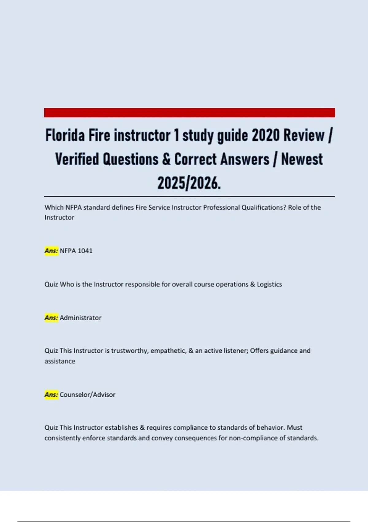 Quiz This Instructor establishes & requires compliance to standards of behavior. Must