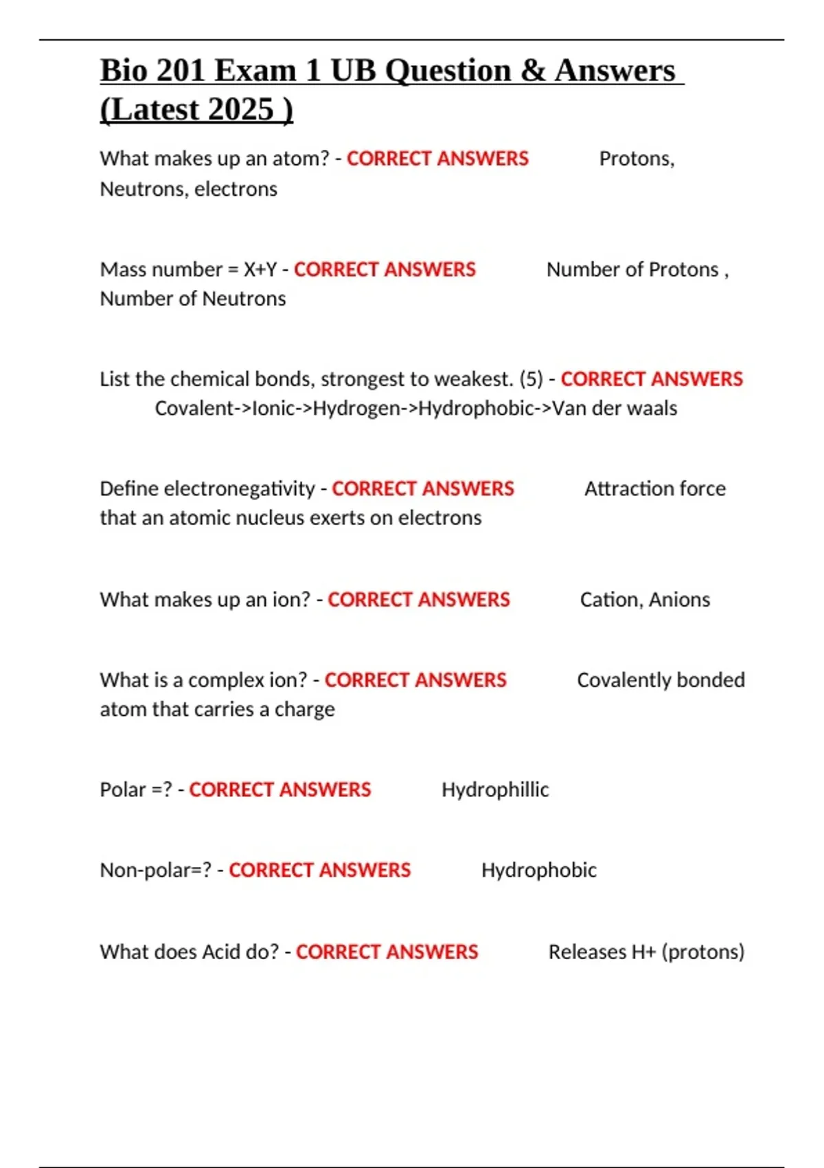 , Bio 201 Exam 1 UB Question & Answers