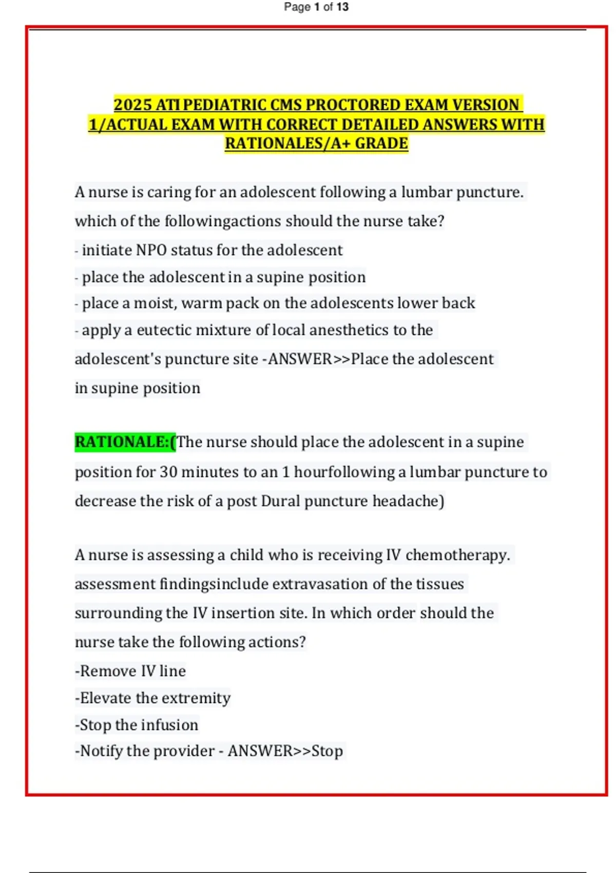 2025 ATI PEDIATRIC CMS PROCTORED EXAM VERSION