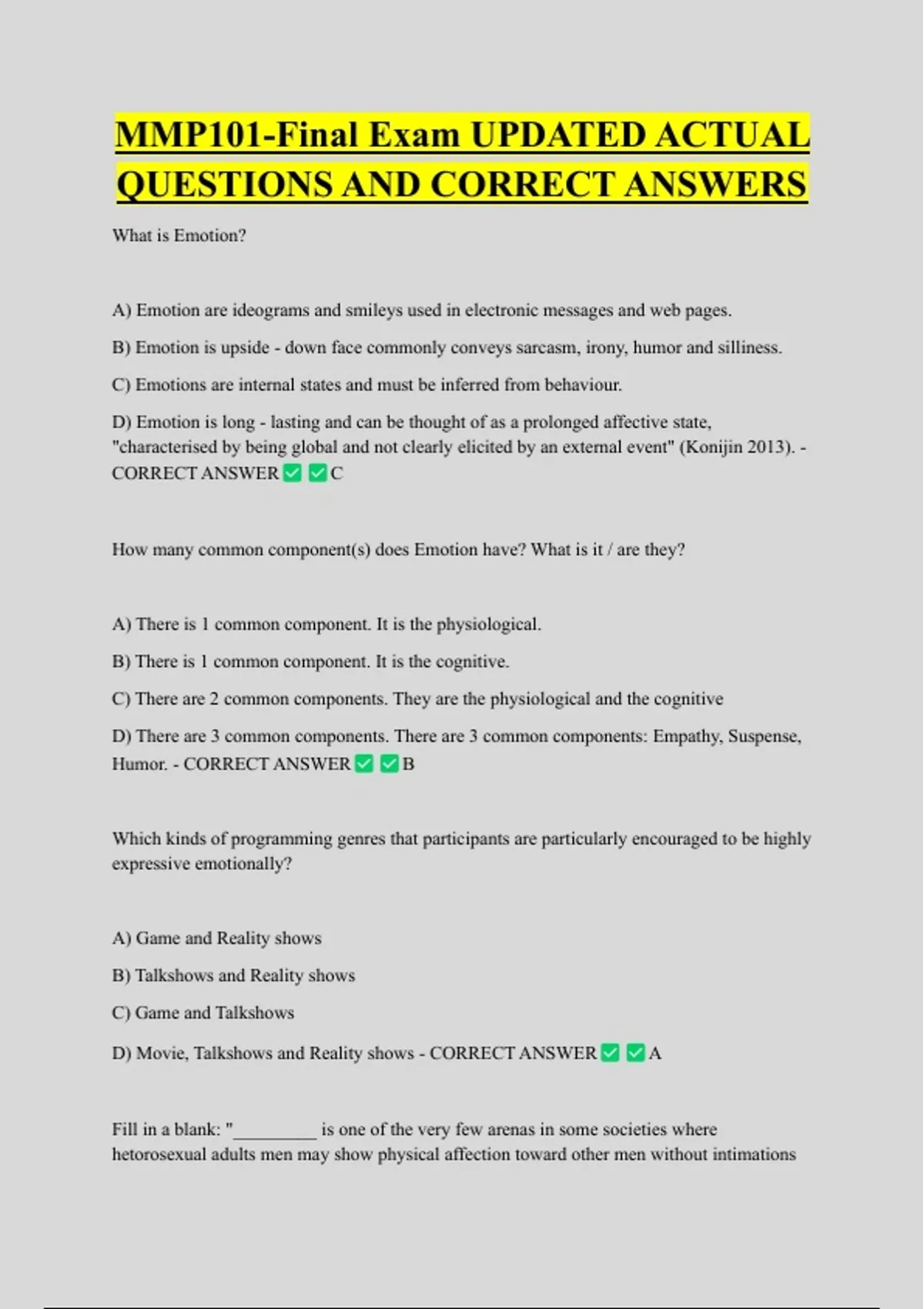 MMP101-Final Exam UPDATED ACTUAL QUESTIONS AND CORRECT ANSWERS What is Emotion? A) Emotion are ideograms and smileys used in electronic messages and web pages. B) Emotion is upside - down face commonly conveys sarcasm, irony, humor and silliness. C) Emotions are internal states and must be inferred from behaviour. D) Emotion is long - lasting and can be thought of as a prolonged affective state, "characterised by being global and not clearly elicited by an external event" (Konijin 2013). - CORRECT ANSWER C How many common component(s) does Emotion have? What is it / are they? A) There is 1 common component. It is the physiological. B) There is 1 common component. It is the cognitive. C) There are 2 common components. They are the physiological and the cognitive D) There are 3 common components. There are 3 common components: Empathy, Suspense, Humor. - CORRECT ANSWER B