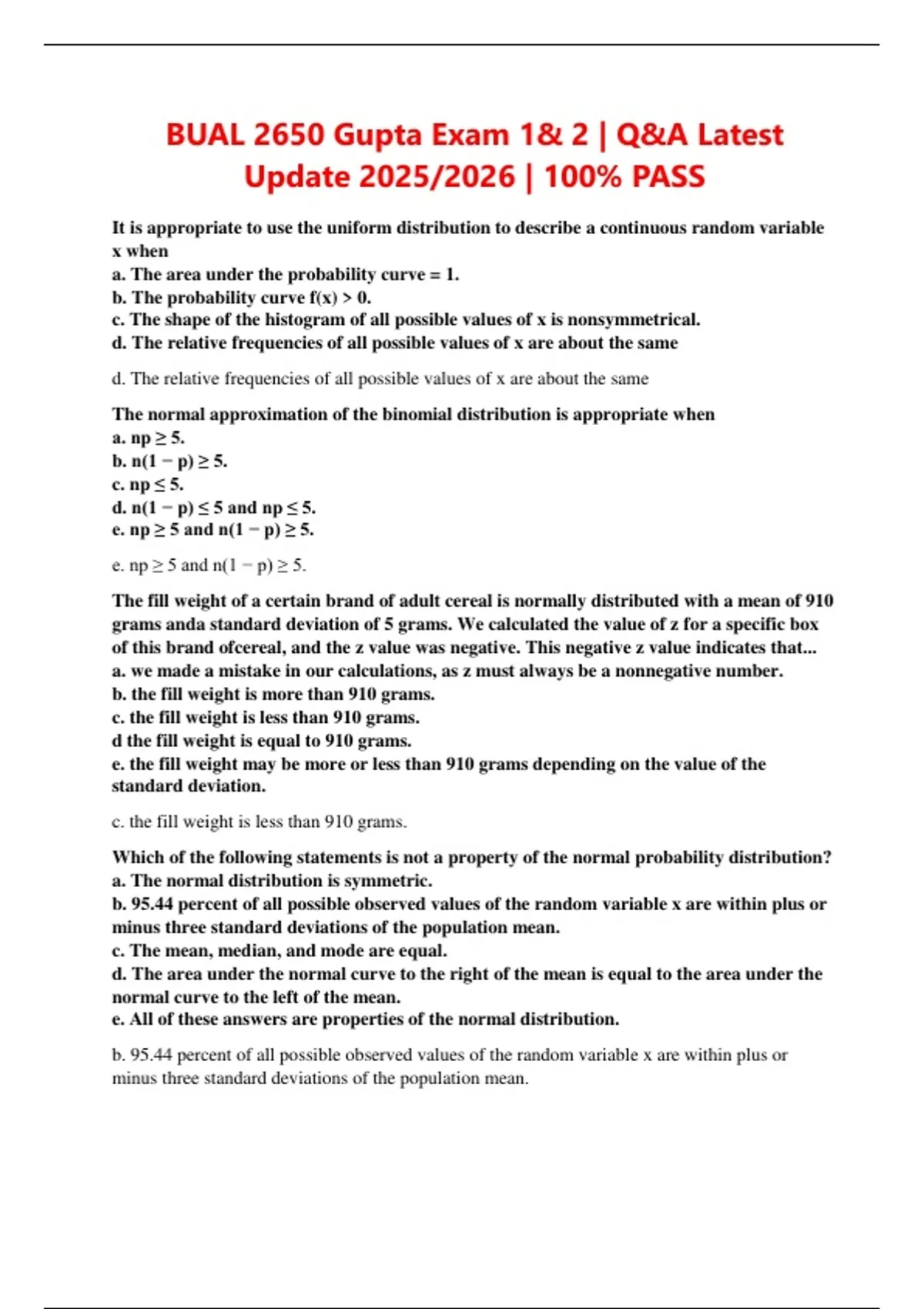BUAL 2650 Gupta Exam 1& 2 | Q&A Latest Update 2025/2026 | 100% PASS