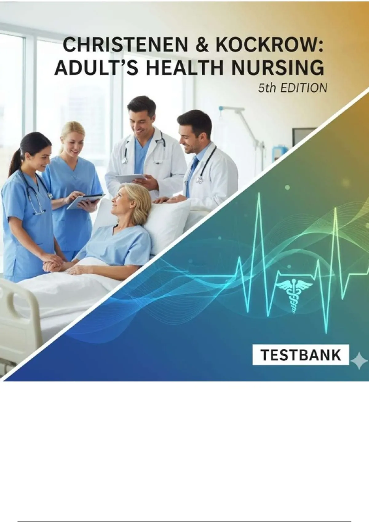 This document contains the complete test bank for Adult Health Nursing by Christensen & Kockrow, 5th Edition. It provides a wide range of exam-style questions and answers that cover all chapters of the textbook. This resource is designed to help nursing students prepare for quizzes, exams, and clinical assessments by reinforcing key concepts in adult health nursing.