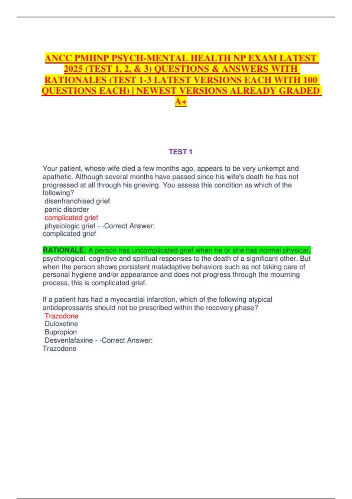 ANCC PMHNP PSYCH-MENTAL HEALTH NP EXAM LATEST 2025 (TEST 1, 2, & 3) QUESTIONS & ANSWERS WITH RATIONALES (TEST 1-3 LATEST VERSIONS EACH WITH 100 QUESTIONS EACH) | NEWEST VERSIONS ALREADY GRADED A+