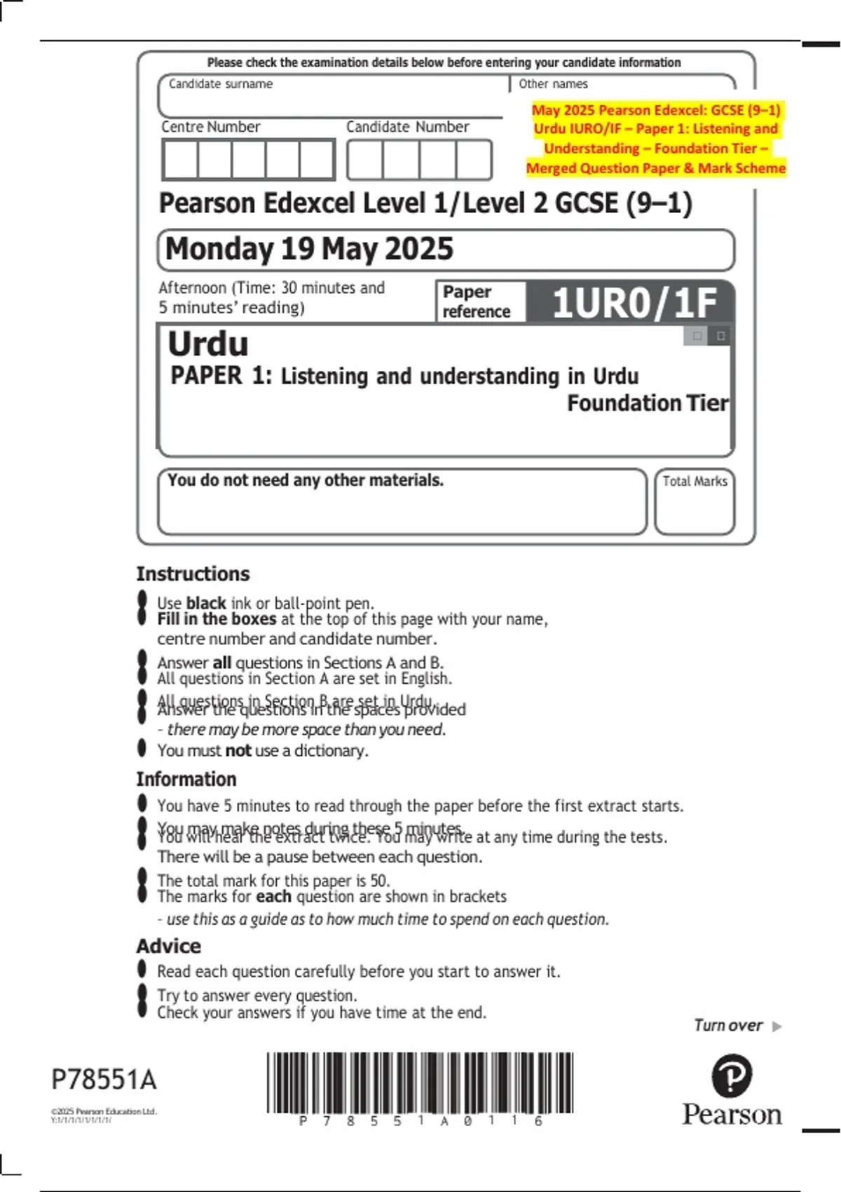 May 2025 Pearson Edexcel: GCSE (9–1) Urdu IURO/IF – Paper 1: Listening and Understanding – Foundation Tier – Merged Question Paper & Mark Scheme