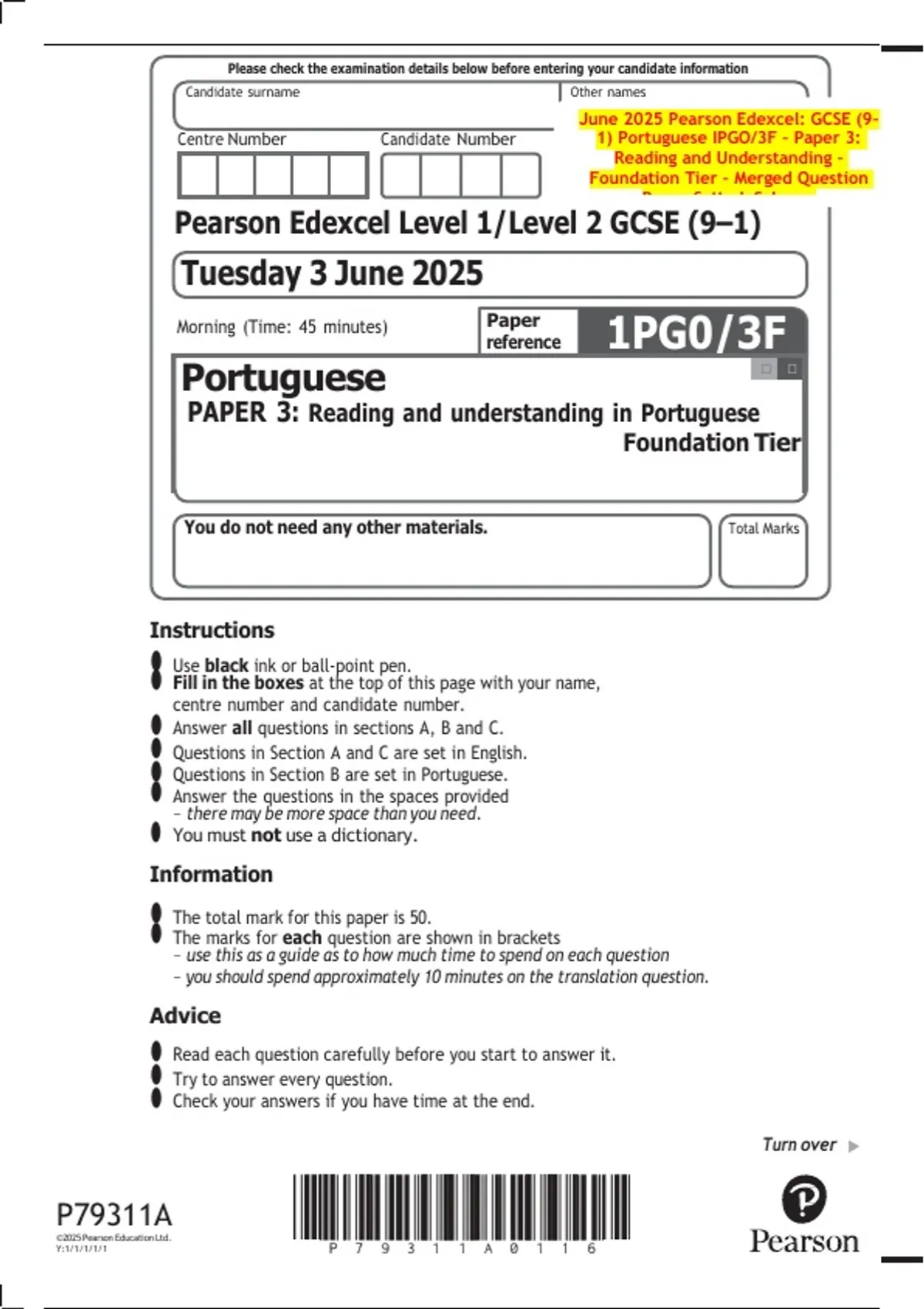 Centre Number Candidate Number 1) Portuguese IPGO/3F – Paper 3: