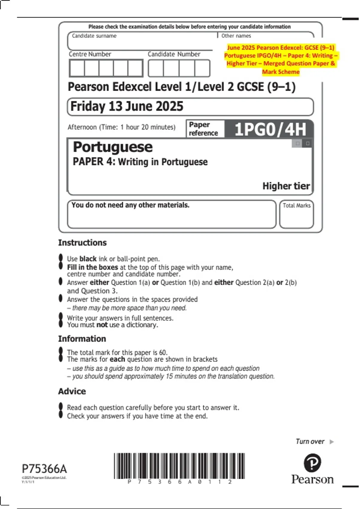 June 2025 Pearson Edexcel: GCSE (9–1) Portuguese IPGO/4H – Paper 4: Writing – Higher Tier – Merged Question Paper & Mark Scheme