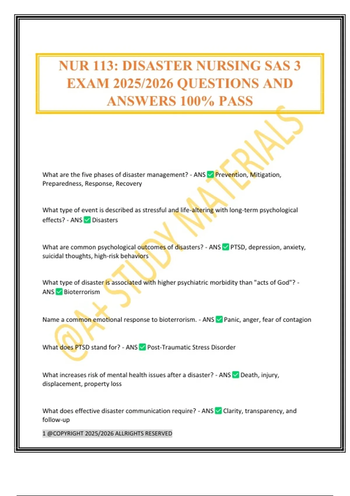 NUR 113: DISASTER NURSING SAS 3 EXAM 2025/2026 QUESTIONS AND ANSWERS 100% PASS
