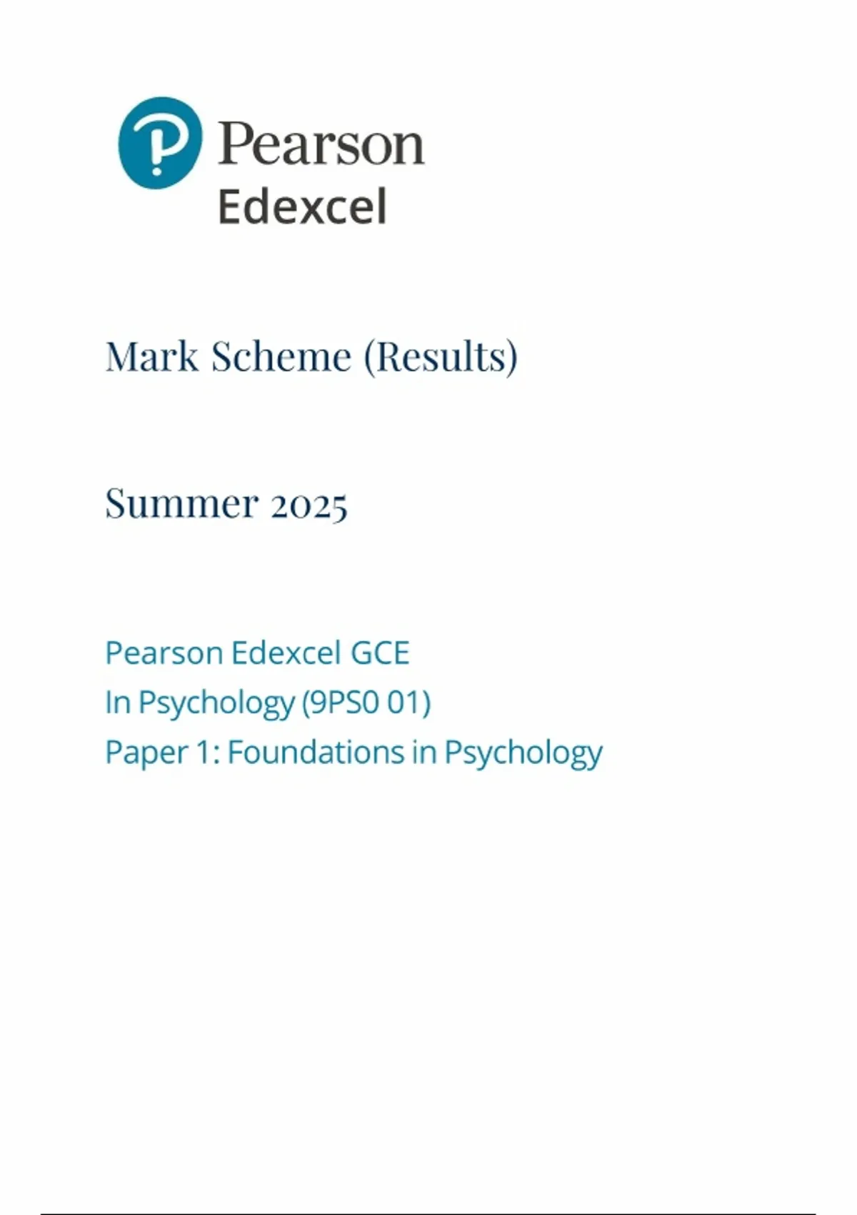 PEARSON EDEXCEL A LEVEL PSYCHOLOGY PAPER 1 MARK SCHEME 2025 (9PS0/01: Foundations in Psychology)