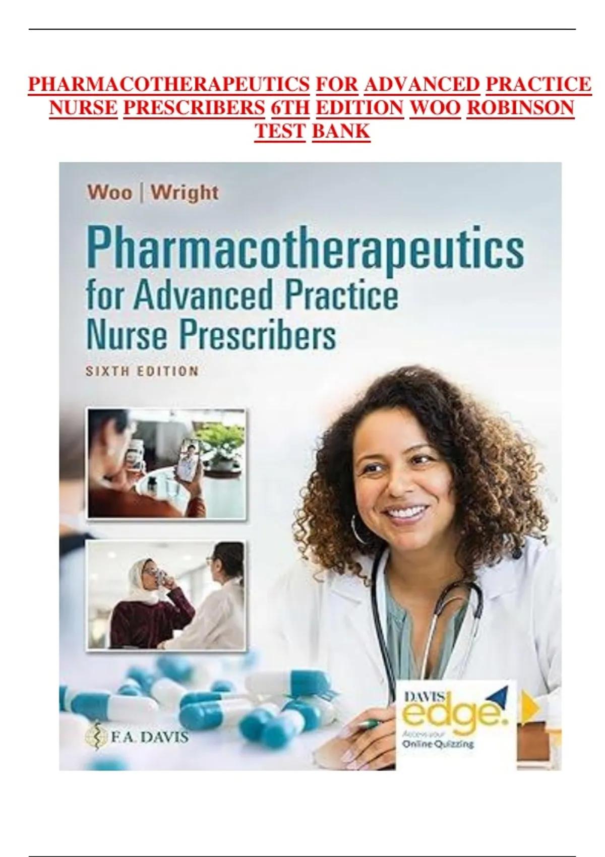 TEST BANK; Pharmacotherapeutics for Advanced Practice Nurse Prescribers, 5th editionTEST BANK; Pharmacotherapeutics for Advanced Practice Nurse Prescribers, 5th edition Woo Robinson. Chapter 1-55 Questions And Answers in 244 Pages. Chapter 1. The Role of the Nurse Practitioner as P r escriber Chapter 2. Review of the Basic Principles of Pharmacology Multiple Choice Chapter 3. Rational Drug Selecti on Answer Section Chapter 4. Legal and Professional Issues in Prescribing Answer Section Chapter 5. Adverse Drug Reactions Answer Section Chapter 6. An Introduction to Pharmacogenetics Chapter 7. Nutrition and Nutraceuticals Answer Section Chapter 8. Herbal Therapies and Cannabis Chapter 9. Information Technology and Pharmacotherapeutics Chapter 10. Pharmacoeconomics Multiple Choice Chapter 11. Drugs Affecting the Autonomic Nervous System Answer Section Chapter 12. Drugs Affecting the Central Nervous System Answer Section Chapter 13. Drugs Affecting the Cardiovascular and Renal Systems Answer Section Chapter 14. Drugs Affecting the Respiratory System Answer Section Chapter 15. Drugs Affecting the Hematological System Answer Section Chapter 16. Drugs Affecting the Immune System Answer Section Chapter 17. Drugs Affecting the Gastrointestinal System Answer Section Chapter 18. Drugs Affecting the Endocrine System: Pancreatic Hormones and Antidiabetic Drugs Chapter 19. Drugs Affecting the Endocrine System: Pituitary, Thyroid, and Adrenal Drugs Chapter 20. Drugs Affecting the Reproductive System Answer SectionChapter 21. Drugs Affecting the Bones and Joints Chapter 22. Drugs Affecting the Integumentary System Chapter 23. Drugs Used in Treating Bacterial Diseases Answer Section Chapter 25. Drugs Used in Treating Inflammatory Processes Multiple Choice Chapter 24. Drugs Used to Treat Viral, Fungal, and Protozoal Infections Chapter 25. Drugs Used in Treating Inflammatory Processes Answer Section Chapter 26. Drugs Used in Treating Eye and Ear Disorders Answer Section Chapter 27. Alcohol and Drug Addiction Chapter 28. Anemia Chapter 29. Angina Chapter 30. Anxiety and Depression Answer Section Chapter 31. Attention Deficit Hyperactivity Disorder Chapter 32. Asthma and Chronic Obstructive Pulmonary Disease Multiple Choice Chapter 33 Contraception Answer Section Chapter 34. Dermatologic Conditions Answer Section Chapter 35 Diabetes Management Chapter 36. Gastroesophageal Reflux and Peptic Ulcer Disease Multiple Choice Chapter 37. Headaches Answer Section Chapter 38. Heart Failure Answer Section Chapter 39. Human Immunodeficiency Virus Disease and Acquired Immunodeficiency Syndrome Chapter 40. Hormone Replacement Therapy Chapter 41. Hyperlipidemia Answer Section Chapter 42. Hypertension Answer Section Chapter 43. Hyperthyroidism and Hypothyroidism Answer Section Chapter 44. Pain Management: Acute and Chronic Pain Answer Section Chapter 45. Pneumonia Answer Section Chapter 46. Tobacco Cessation Answer Section Chapter 47. Sexually Transmitted Diseases and Vaginitis Answer Section Chapter 48. Tuberculosis Answer Section Chapter 49. Upper Respiratory Infection, Pharyngitis, Sinusitis, Otitis Media, and Otitis Externa Answer Section Chapter 50. Urinary Tract Infection Answer Section Chapter 51: Women as Patients Answer Section Chapter 52. Men as Patients Answer Section Chapter 53. Pediatric Patients Answer Section Chapter 54. Transgendered Clients as Patients Chapter 55. Geriatric Patients Multiple Choice ......