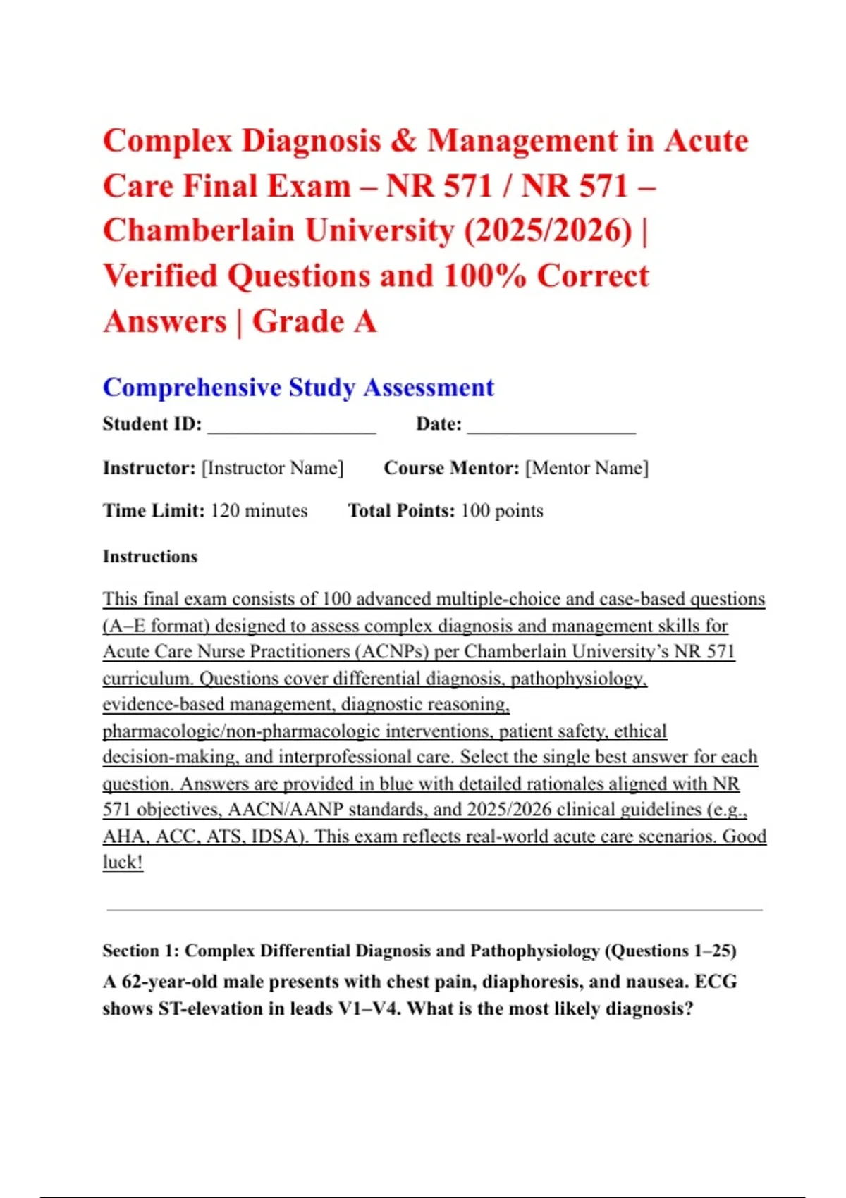 This document provides the verified questions and 100% correct answers for the NR 571 Final Exam – Complex Diagnosis & Management in Acute Care at Chamberlain University for the 2025/2026 academic year. It covers advanced assessment and clinical management of acute and critical conditions across major systems, including cardiovascular, respiratory, renal, and neurological emergencies. Ideal for nurse practitioner students preparing for the NR571 final or reviewing comprehensive acute care diagnostic and treatment principles.