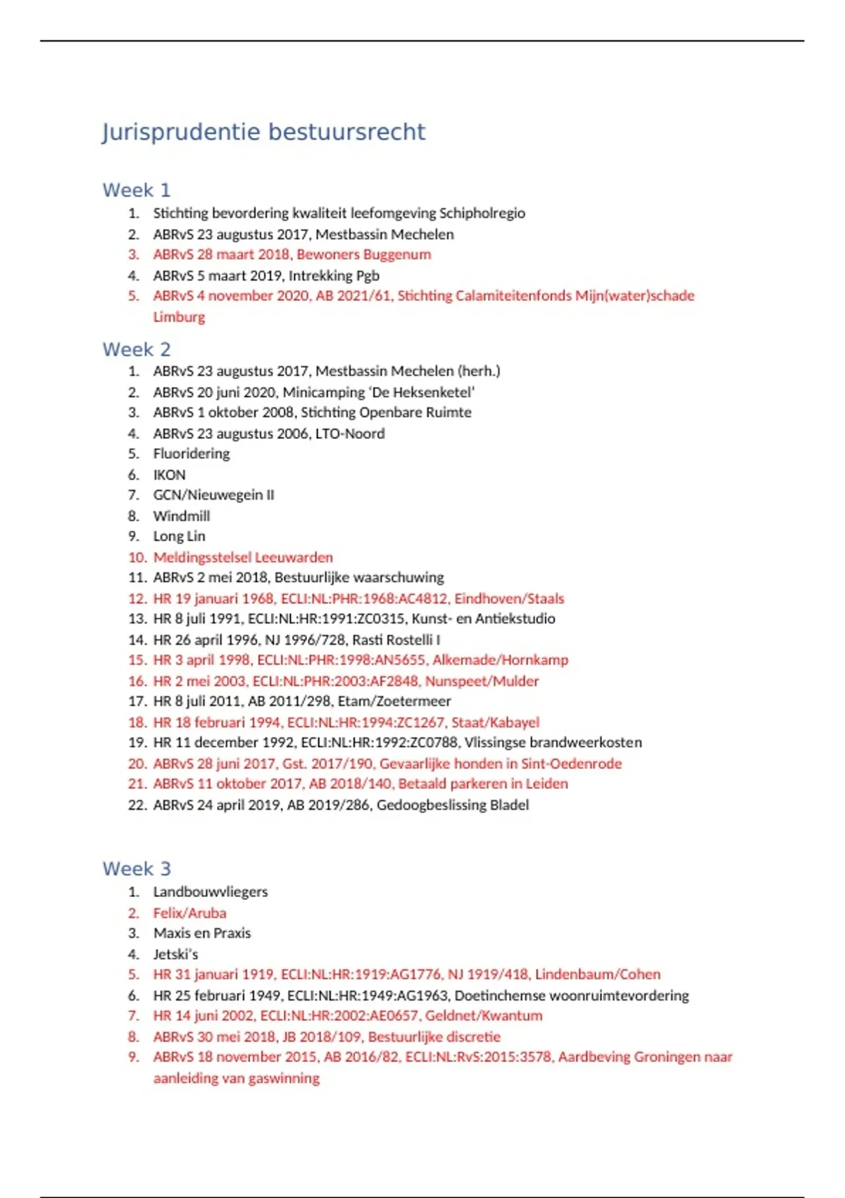 Een overzicht en samenvatting van alle arresten week 1 t/m 6 voor het vak Bestuursrecht. In totaal 22 pagina's.