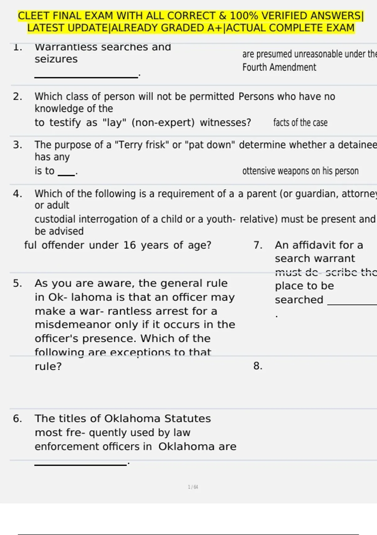 , CLEET FINAL EXAM WITH ALL CORRECT & 100% VERIFIED ANSWERS|