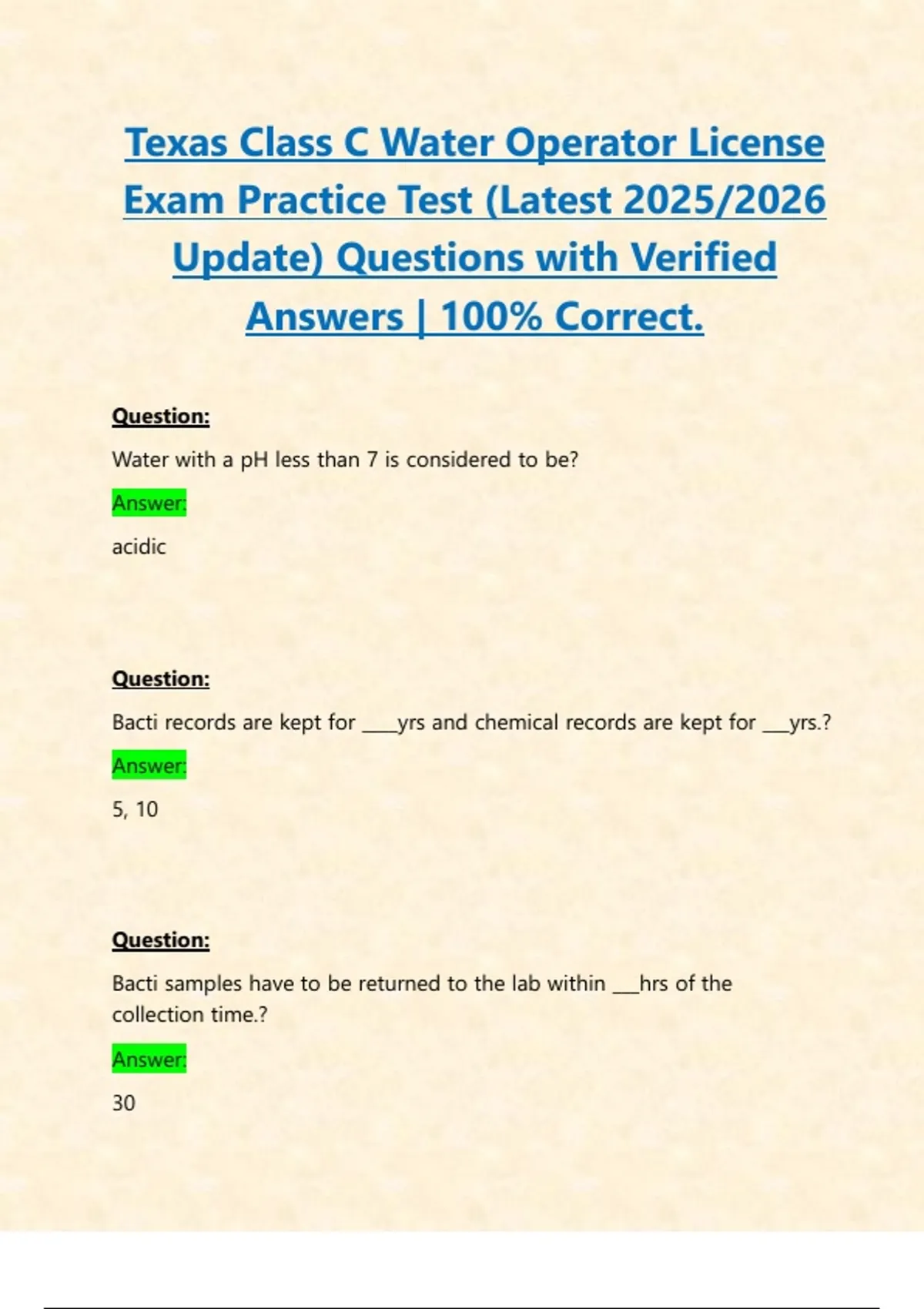 Texas Class C Water Operator License Exam Practice Test (Latest 2025/2026 Update) Questions with Verified Answers | 100% Correct. Texas Class C Water Operator License Exam Practice Test (Latest 2025/2026 Update) Questions with Verified Answers | 100% Correct.