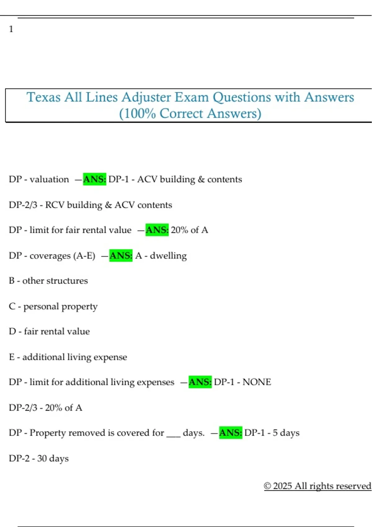 Texas All Lines Adjuster Exam Questions with Answers