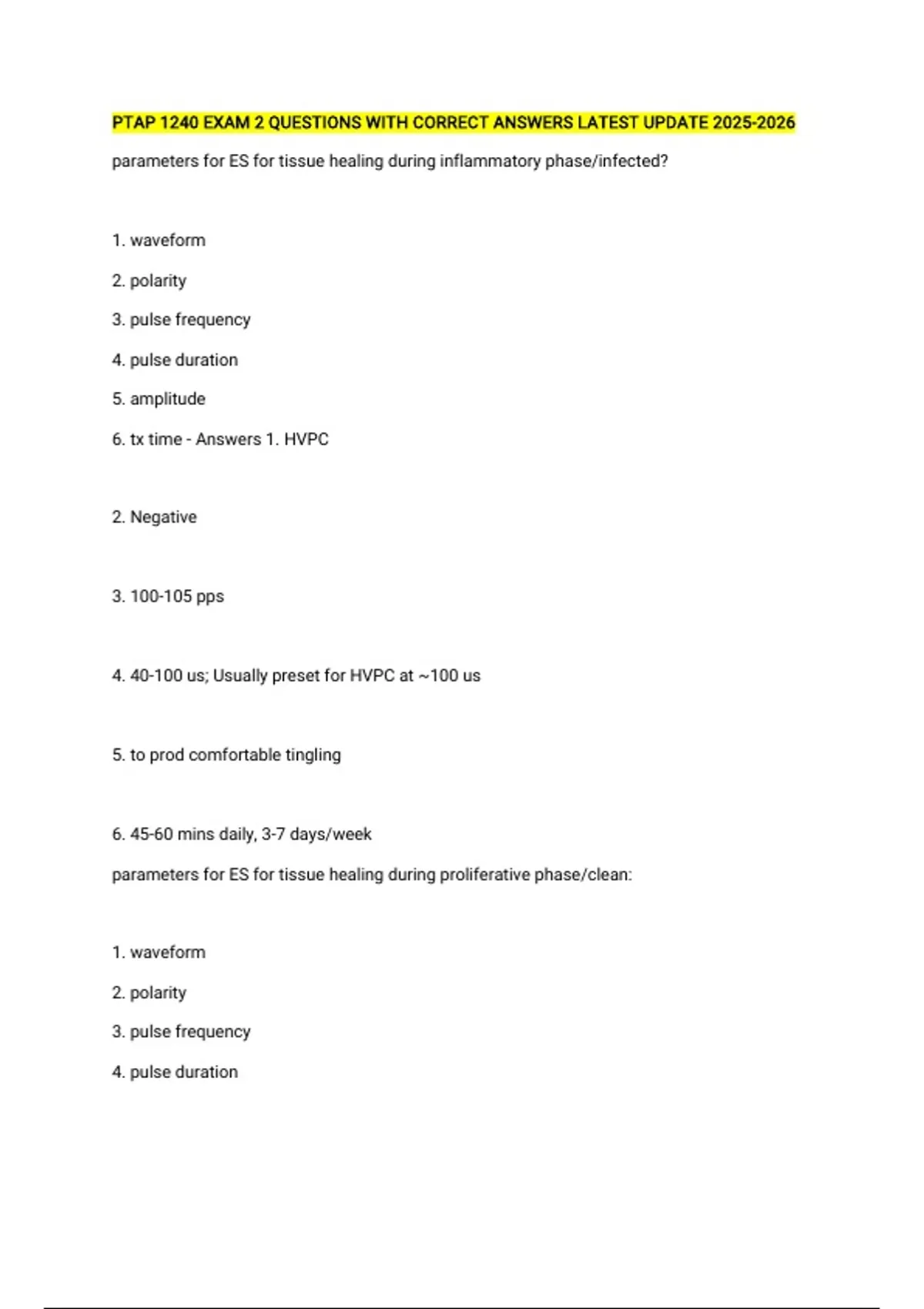 PTAP 1240 EXAM 2 QUESTIONS WITH CORRECT ANSWERS LATEST UPDATE parameters for ES for tissue healing during inflammatory phase/infected? 1. waveform 2. polarity 3. pulse frequency 4. pulse duration 5. amplitude 6. tx time - Answers 1. HVPC 2. Negative 3. 100-105 pps 4. 40-100 us; Usually preset for HVPC at ~100 us 5. to prod comfortable tingling 6. 45-60 mins daily, 3-7 days/week parameters for ES for tissue healing during proliferative phase/clean: 1. waveform 2. polarity 3. pulse frequency 4. pulse duration
