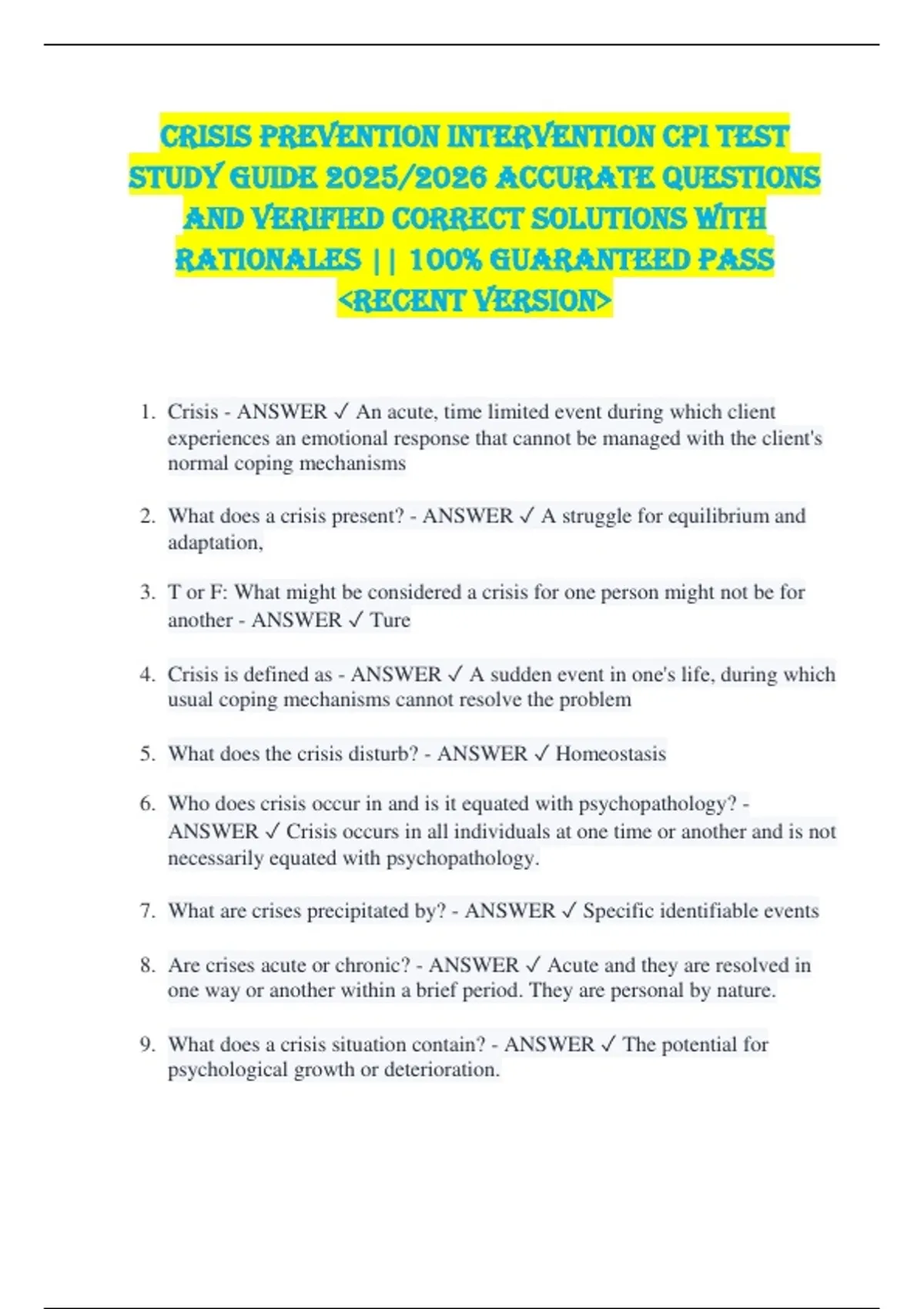 Crisis Prevention Intervention CPI TEST STUDY GUIDE 2025/2026 ACCURATE QUESTIONS AND VERIFIED CORRECT SOLUTIONS WITH RATIONALES || 100% GUARANTEED PASS &lt;RECENT VERSION&gt; 1. Crisis - ANSWER An acute, time limited event during which client experiences an emotional response that cannot be managed with the client's normal coping mechanisms 2. What does a crisis present? - ANSWER A struggle for equilibrium and adaptation, 3. T or F: What might be considered a crisis for one person might not be for another - ANSWER Ture 4. Crisis is defined as - ANSWER A sudden event in one's life, during which usual coping mechanisms cannot resolve the problem 5. What does the crisis disturb? - ANSWER Homeostasis 6. Who does crisis occur in and is it equated with psychopathology? - ANSWER Crisis occurs in all individuals at one time or another and is not necessarily equated with psychopathology. 7. What are crises precipitated by? - ANSWER Specific identifiable events 8. Are crises acute or chronic? - ANSWER Acute and they are resolved in one way or another within a brief period. They are personal by nature. 9. What does a crisis situation contain? - ANSWER The potential for psychological growth or deterioration. 10. What are the types of crisis? - ANSWER Maturational Situational, and Adventitious 11. Maturational/ developmental crisis - ANSWER Occurs in response to a situation that triggers emotions related to unresolved conflicts in one's life, Erikson's stages of growth and development. 12. Situational Crisis - ANSWER When an external source is the precipitator of a crisis, often unanticipated. 13. Examples of situational crisis - ANSWER Death of a loved one, loss/change of job, divorce, financial change, severe physical illness. 14. Who are situational life evens often supported by? - ANSWER By family/friends and utilizes individuals resiliency. 15. Adventitious Crisis - ANSWER A crisis or disaster that is not common pat of everyday life. 16. Examples of adventitious crisis: - ANSWER Unplanned, such as natural disasters; fires, hurricanes, terroristic attacks, crimes of violence, mass shootings. 17. Who can be involved in an adventitious crisis? - ANSWER Can be an individual or group of people. 18. What are some nursing diagnosis made by the disaster nurse? - ANSWER Risk for injury, infection, and post-trauma syndrome, anxiety, fear, spiritual distress, and ineffective community coping. 19. What are identified as criteria for evaluation by the disaster nurse? - ANSWER Outcome behaviors 20. What does evaluation consist of for the disaster nurse? - ANSWER Reassessment to determine if the nursing interventions have been successful in achieving the objectives of care. 21. Crisis Development/Behavior Levels - ANSWER 1. Anxiety 2. Defensive 3. Risk behavior 4. Tension reduction 22. Staff Attitudes/Approaches - ANSWER 1. Supportive 2. Directive 3. Physical intervention 4. Therapeutic rapport 23. Facilitation Formula - Declarative Knowledge - ANSWER Knowing WHAT Term -&gt; Definition -&gt; Examples 24. Facilitation Formula - Procedural Knowledge - ANSWER Knowing HOW Demonstrate/describe -&gt; Participate/practice -&gt; Explain/expand 25. Aggression - ANSWER Behavior that is characterized by vigorous, intense, or hostile actions. 26. Violence - ANSWER Any behavior where force is used to injure or abuse another person, usually intending to cause injury. 27. Core Values - ANSWER Care, Welfare, Safety, and Security 28. Crisis Development Model - ANSWER 4 Crisis Development/Behavior Levels 4 Staff Attitudes/Approaches 29. Responsibilities After a Crisis Event - ANSWER Recording and reporting; ensuring ll involved are alright 30. What is the value of learning the four levels and corresponding staff attitudes? - ANSWER Helps you intervene early and appropriately. Helps you avoid overreacting and underreacting. Helps you avert crisis. 31. Verbal Escalation Continuum - ANSWER Questioning Refusal Release Intimidation Tension Reduction 32. Three reasons you should use the Supportive Stance. - ANSWER 1. Communicates respect 2. Nonthreatening 3. Safety 33. Two ways the Decision-Making Matrix model is used to consider risk. - ANSWER Likelihood Severity 34. Due Care Guidelines - ANSWER Respect other participants as peers Responsible for the safety of others with regards to my actions Will not engage in horseplay Will not teach other skills 35. CPI Verbal Escalation Continuum - ANSWER 1. Questioning 2. Refusal-set limits 3. Release (isolate/call aside/allow to vent) 4. Intimidation 5. Tension Reduction 36. Keys to Setting limits - ANSWER 1. REasonable 2. Simple 3. Enforceable 37. Verbal intervention tips (Dos) - ANSWER 1. Set limits / 2. consistent / 3. Calm / 4. allow for silence / 5. Fair / 6. Listen / Monitor Paraverbals 38. Verbal intervention tips (Don'ts) - ANSWER 1. back into corner // 2. dismiss 3. make assumptions / 4. be Insincere/phony 39. Primary Prevention - ANSWER protect healthy people from developing a disease and keep them healthy