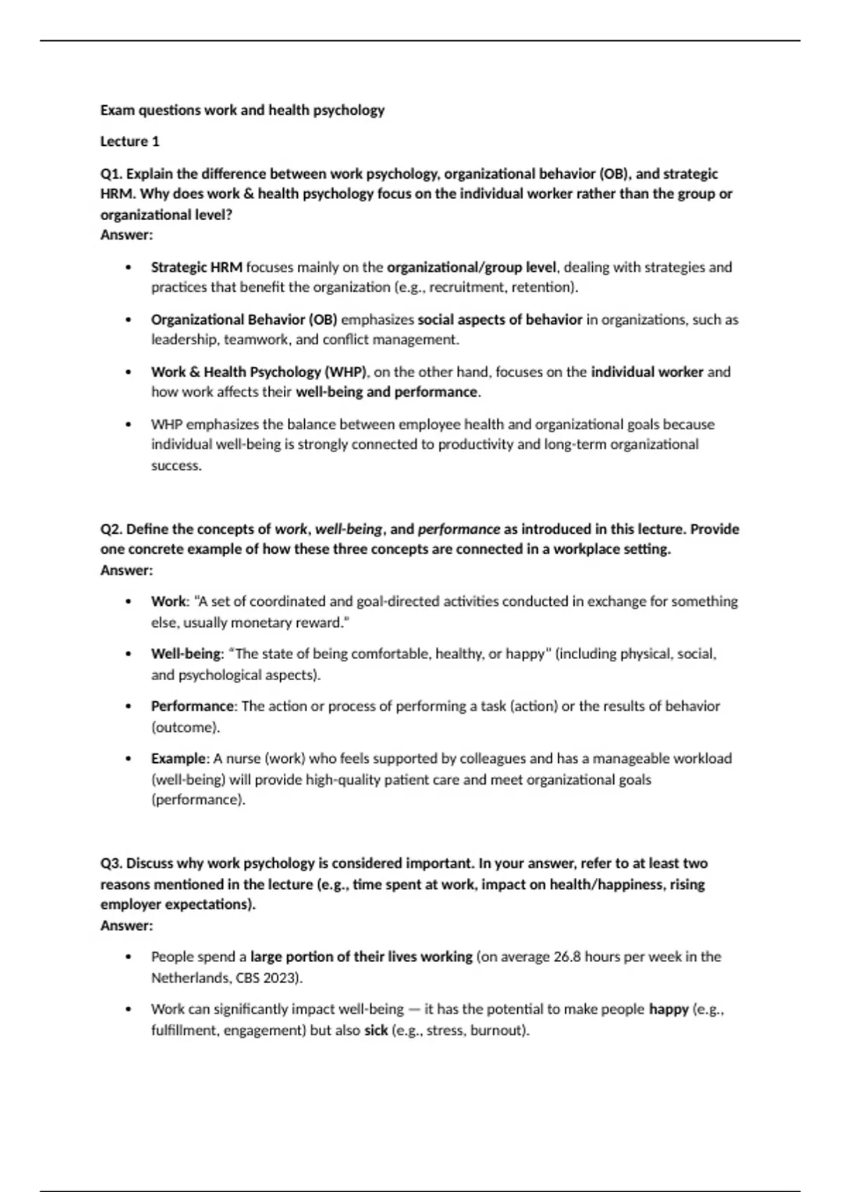 Q1. Explain the difference between work psychology, organizational behavior (OB), and strategic