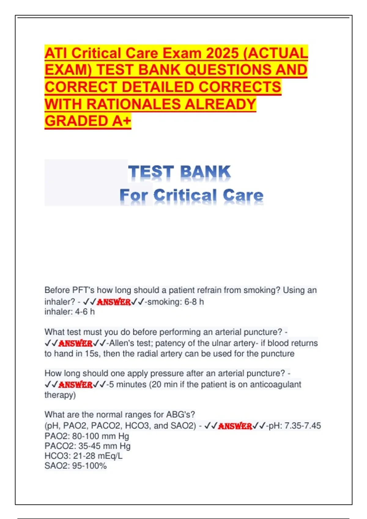(pH, PAO2, PACO2, HCO3, and SAO2) - ✔✔ANSWER✔✔-pH: 7.35-7.45