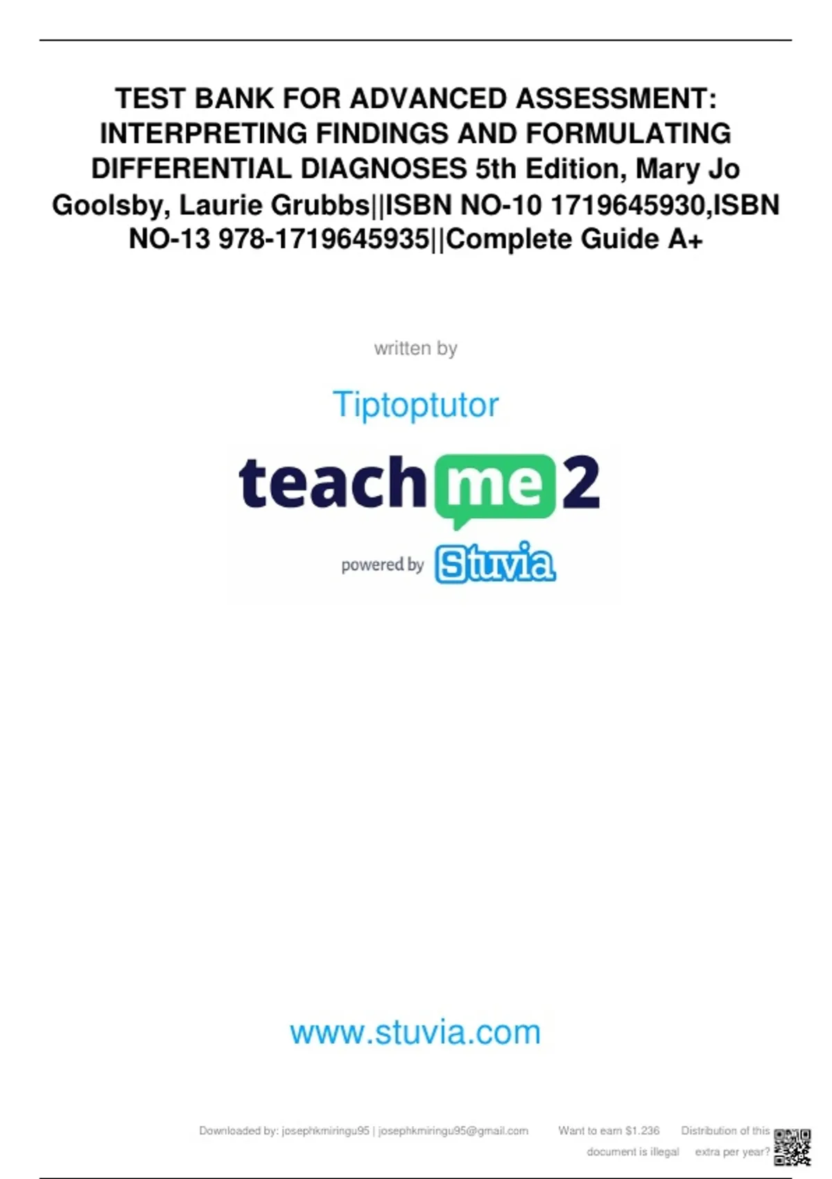 TEST BANK FOR ADVANCED ASSESSMENT: INTERPRETING FINDINGS AND FORMULATING DIFFERENTIAL DIAGNOSES 5th Edition, Mary Jo Goolsby, Laurie Grubbs||ISBN NO-,ISBN NO-||Complete Guide A+