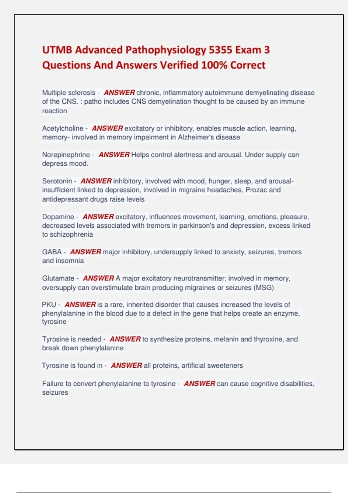 UTMB Advanced Pathophysiology 5355 Exam 3 Questions And Answers Verified 100% Correct Multiple sclerosis - ANSWER chronic, inflammatory autoimmune demyelinating disease of the CNS. : patho includes CNS demyelination thought to be caused by an immune reaction Acetylcholine - ANSWER excitatory or inhibitory, enables muscle action, learning, memory- involved in memory impairment in Alzheimer's disease Norepinephrine - ANSWER Helps control alertness and arousal. Under supply can depress mood. Serotonin - ANSWER inhibitory, involved with mood, hunger, sleep, and arousal- insufficient linked to depression, involved in migraine headaches, Prozac and antidepressant drugs raise levels Dopamine - ANSWER excitatory, influences movement, learning, emotions, pleasure, decreased levels associated with tremors in parkinson's and depression, excess linked to schizophrenia GABA - ANSWER major inhibitory, undersupply linked to anxiety, seizures, tremors and insomnia Glutamate - ANSWER A major excitatory neurotransmitter; involved in memory, oversupply can overstimulate brain producing migraines or seizures (MSG) PKU - ANSWER is a rare, inherited disorder that causes increased the levels of phenylalanine in the blood due to a defect in the gene that helps create an enzyme, tyrosine Tyrosine is needed - ANSWER to synthesize proteins, melanin and thyroxine, and break down phenylalanine Tyrosine is found in - ANSWER all proteins, artificial sweeteners Failure to convert phenylalanine to tyrosine - ANSWER can cause cognitive disabilities, seizures Myasthenia gravis patho - ANSWER patho includes antibodies that attach to receptor sites and block the binding of acetylcholine causing atrophy of muscles and decrease use Attention defecit disorder - ANSWER excessive frontal lobe activity resulting in frontal lobe dysfunction (hyperactivity) Triad of symptoms for ADHD - ANSWER inattentiveness, impulsivity, hyperactivity, multimodal regimen needs to be considered Dementia characteristics - ANSWER is an acquired impairment of intellectual function, memory and language with alteration in behavior and can be caused by trauma, vascular disease, infection and progressive neurodegeneration. AD is most common chronic irreversible dementia Delirium characteristics - ANSWER acute confusional state, transient disorders of awareness that have sudden or gradual onset can be caused by alcohol or drugs, withdrawal from, metabolic disorders, trauma, anesthesia, fever/heatstroke, electrolyte imbalance, organ failure Migraine Headaches - ANSWER a common, multifactorial, disabling, recurrent and hereditary neurovascular headache disorders. can begin with auras. usually unilateral and pulsating auras - ANSWER transient focal neurological symptoms whose origin is though to involve the hypothalamus, brainstem and cortex Migraines are - ANSWER an inflammatory process. The MAIN POINTS are that there are likely alterations in serotonin and other neurotransmitters, neurologic, vascular (inflammation) and hormonal components (estrogen). Neurovascular Hypothesis - ANSWER A trigger alters a specific area of the brain stem called the locus ceruleus and triggers release of serotonin into the trigeminal vascular tree. Not all patients are able to identify a trigger. Those commonly identified include lack of sleep, stress, hormonal changes, physical exertion, weather changes or certain foods (most commonly wine caffeine, monosodium glutamate, nitrates, and artificial sweeteners). Perivascular inflammatory process - ANSWER Pain sensors in the ophthalmic branch of the trigeminal nerve become active and release neuropeptides that cause dilation of blood vessels. This produces even more nerve irritation. The inflammatory response and distended blood vessels stimulate the trigeminal nerve; producing pain long after the trigger is gone. Menstrual migraines are thought to be triggered by changes in estrogen levels - ANSWER Estrogen levels rise after ovulation. Falling levels of estrogen during the premenstrual period may trigger the onset of migraine. Process of neurotransmitter transmission between two neurons - ANSWER 1)action potentials arrive at axon terminal 2) Voltage gated Ca+ channels open 3) Ca++ enters cells 4) Ca++ signals to vesicles 5)Vesicles move to the membrane 6)Vesicles release neurotransmitters by exocytosis 7)Neurotransmitter diffuses across synaptic cleft and binds to receptors The neurotransmitters that could be involved in the different types of anxiety disorders (i.e., panic) - ANSWER Major ones are norepinephrine serotonin, and gamma- aminobutyric acid. Increases would be seen in norepinephrine and serotonin (opposite in depression). Dysregulation of the brain GABA - ANSWER benzodiazepine receptor system may contribute to the development of panic attacks. Altered in panic disorder related to a reduction in the benzodiazepine (BZ) receptor binding. BZ plays a role in GABA producing a neuronal inhibitory effect. Anxiety Disorders - ANSWER associated with GABA dysfunction, most prevalent psych disorder, out of proportion to actual threat posed impairs daily functioning. often occu r with major depression. patient needs to be screened for other disease processes first Generalized Anxiety Disorder (GAD) - ANSWER uncontrollable chronic worry that is unrealistic and excessive, persisting for at least 6 months Panic Disorder - ANSWER an anxiety disorder that consists of sudden, overwhelming attacks of terror lasting less than 30 minutes, sense of impending doom, patients avoid situations to avoid precipitating attacks Social Phobia - ANSWER extreme, persistent fear of social or performance situations Obsessive Compulsive Disorder - ANSWER recurrent obsessions that cause marked