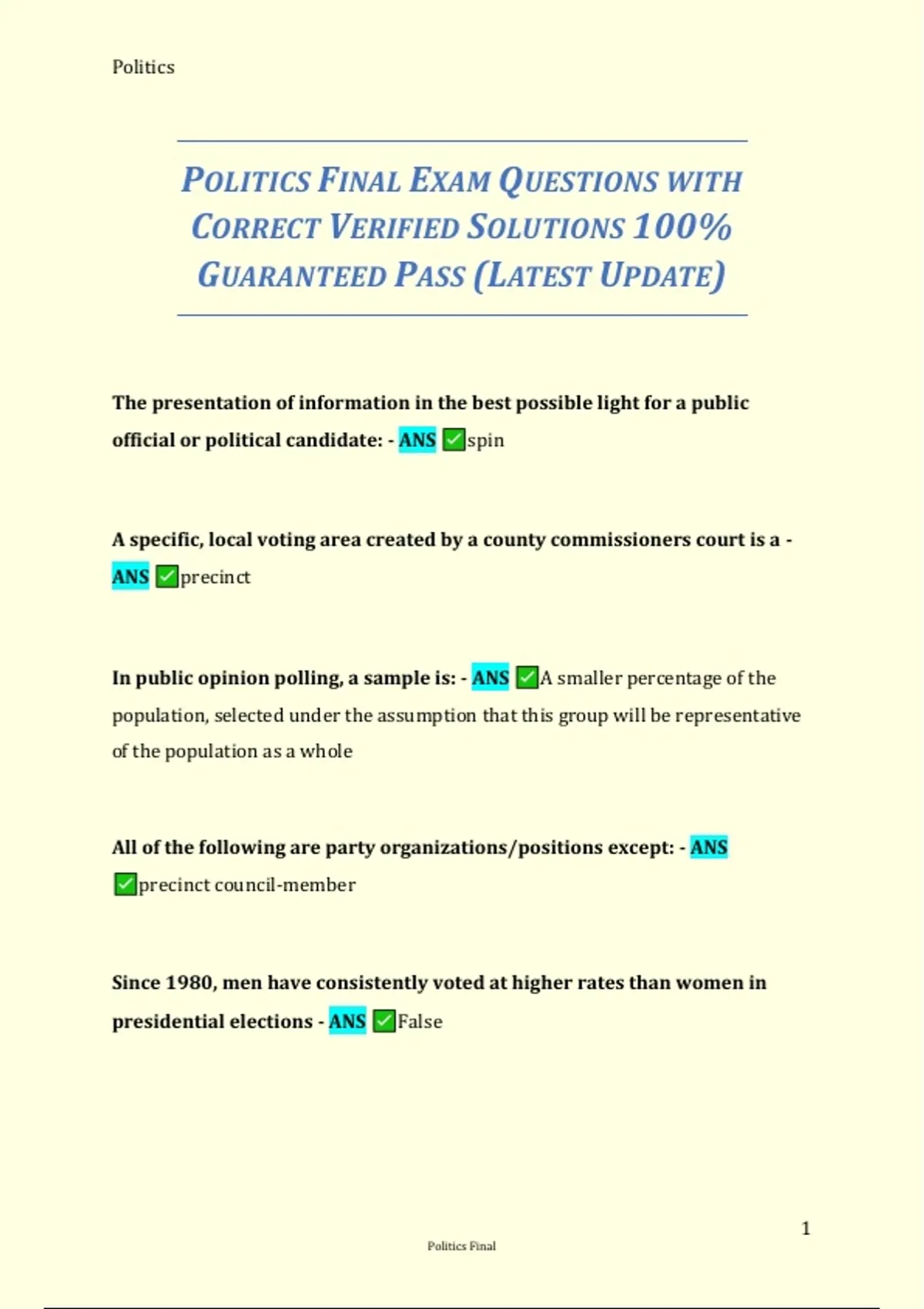 POLITICS FINAL EXAM QUESTIONS WITH CORRECT VERIFIED SOLUTIONS 100% GUARANTEED PASS (LATEST UPDATE)