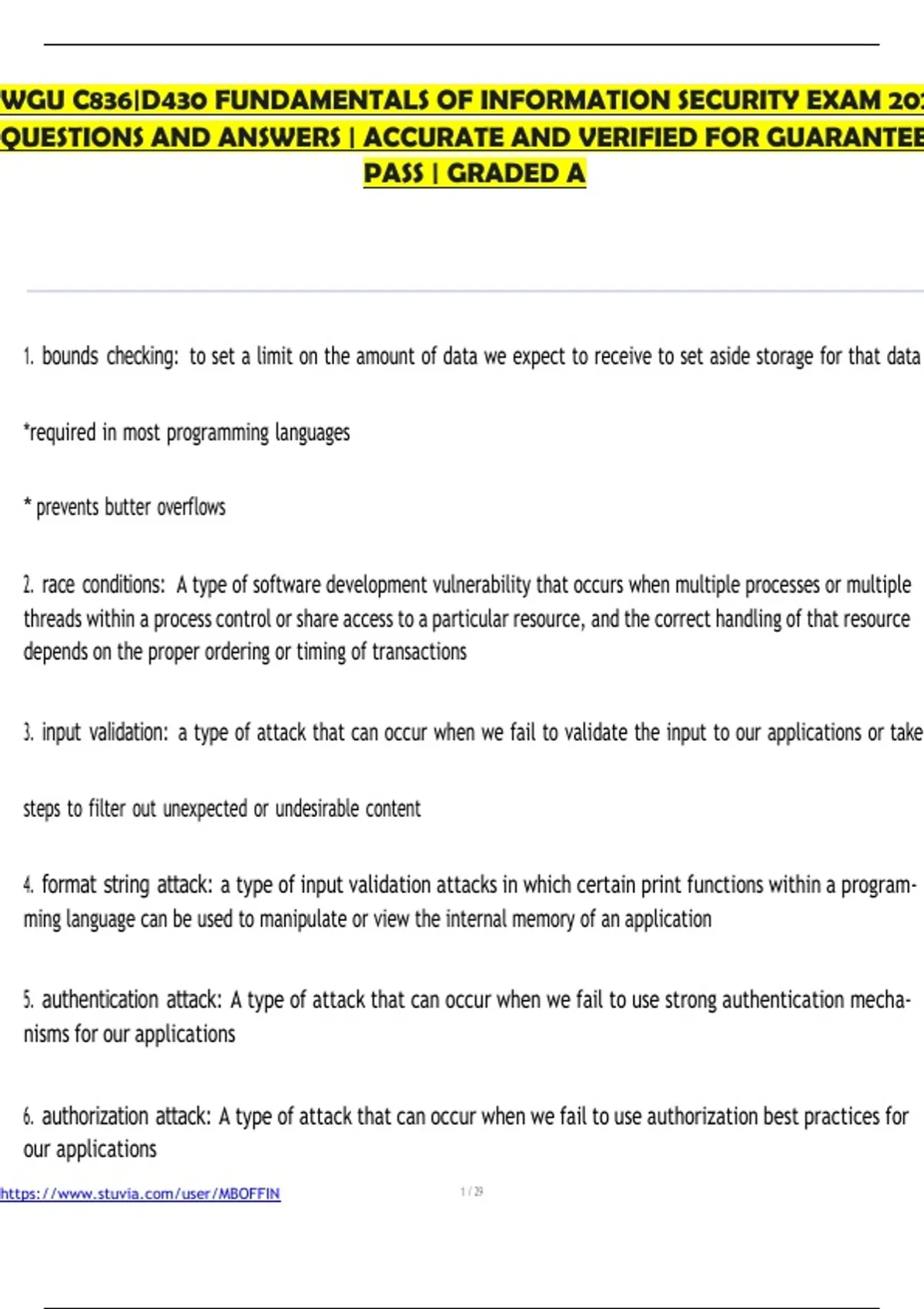 WGU C836|D430 FUNDAMENTALS OF INFORMATION SECURITY EXAM 2025 QUESTIONS AND ANSWERS | ACCURATE AND VERIFIED FOR GUARANTEED PASS | GRADED A WGU C836|D430 FUNDAMENTALS OF INFORMATION SECURITY EXAM 2025 QUESTIONS AND ANSWERS | ACCURATE AND VERIFIED FOR GUARANTEED PASS | GRADED A WGU C836|D430 FUNDAMENTALS OF INFORMATION SECURITY EXAM 2025 QUESTIONS AND ANSWERS | ACCURATE AND VERIFIED FOR GUARANTEED PASS | GRADED A WGU C836|D430 FUNDAMENTALS OF INFORMATION SECURITY EXAM 2025 QUESTIONS AND ANSWERS | ACCURATE AND VERIFIED FOR GUARANTEED PASS | GRADED A WGU C836|D430 FUNDAMENTALS OF INFORMATION SECURITY EXAM 2025 QUESTIONS AND ANSWERS | ACCURATE AND VERIFIED FOR GUARANTEED PASS | GRADED A
