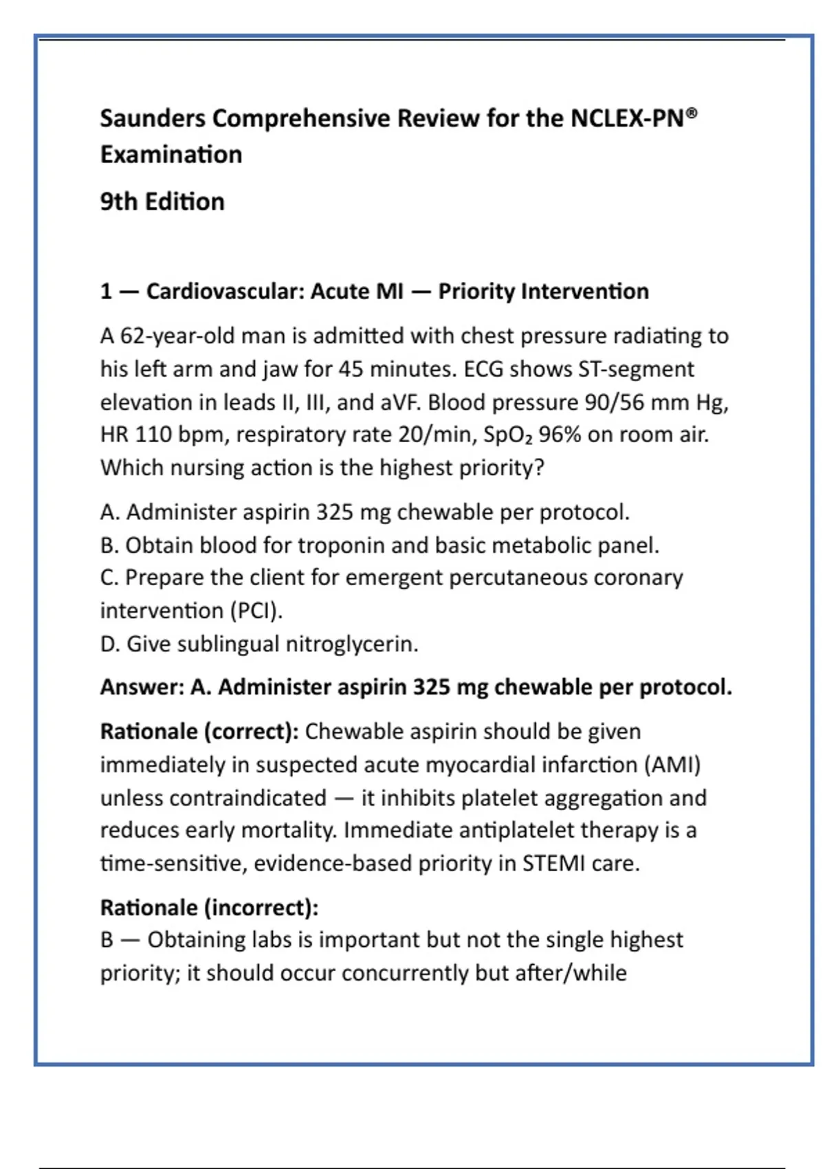 Rationale (correct): Chewable aspirin should be given