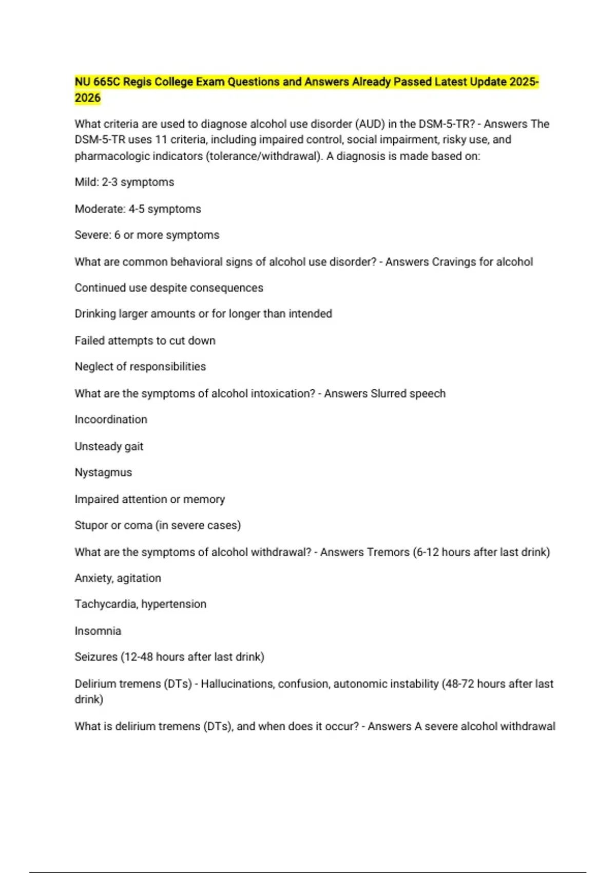 NU 665C Regis College Exam Questions and Answers Already Passed Latest Update What criteria are used to diagnose alcohol use disorder (AUD) in the DSM-5-TR? - Answers The DSM-5-TR uses 11 criteria, including impaired control, social impairment, risky use, and pharmacologic indicators (tolerance/withdrawal). A diagnosis is made based on: Mild: 2-3 symptoms Moderate: 4-5 symptoms Severe: 6 or more symptoms What are common behavioral signs of alcohol use disorder? - Answers Cravings for alcohol Continued use despite consequences Drinking larger amounts or for longer than intended Failed attempts to cut down Neglect of responsibilities What are the symptoms of alcohol intoxication? - Answers Slurred speech Incoordination Unsteady gait Nystagmus Impaired attention or memory Stupor or coma (in severe cases) What are the symptoms of alcohol withdrawal? - Answers Tremors (6-12 hours after last drink) Anxiety, agitation Tachycardia, hypertension Insomnia Seizures (12-48 hours after last drink) Delirium tremens (DTs) - Hallucinations, confusion, autonomic instability (48-72 hours after last drink) What is delirium tremens (DTs), and when does it occur? - Answers A severe alcohol withdrawal syndrome with confusion, hallucinations, and autonomic hyperactivity (tachycardia, hypertension). Occurs 48-72 hours after last drink. What is the first-line treatment for acute alcohol withdrawal? - Answers Benzodiazepines (e.g., lorazepam, diazepam, chlordiazepoxide) to prevent seizures and DTs. What medications are FDA-approved for alcohol use disorder? - Answers Naltrexone - Blocks opioid receptors, reduces cravings Acamprosate - Modulates glutamate, reduces cravings Disulfiram - Inhibits aldehyde dehydrogenase, causing an aversive reaction if alcohol is consumed Which medication should be avoided in patients with liver disease? - Answers Naltrexone (can cause hepatotoxicity) What are common screening tools for alcohol use disorder? - Answers AUDIT (Alcohol Use Disorders Identification Test) - Identifies hazardous drinking CAGE questionnaire - 4-question screening for alcohol dependence (Cut down, Annoyed, Guilty, Eye-opener) CIWA-Ar (Clinical Institute Withdrawal Assessment for Alcohol) - Assesses alcohol withdrawal severity What are common screening tools for opioid use disorder? - Answers ORT (Opioid Risk Tool) - Assesses risk of opioid misuse SOAPP (Screener and Opioid Assessment for Patients with Pain) - Evaluates risk of opioid abuse in chronic pain patients DAST (Drug Abuse Screening Test) - General screening for drug use disorders What are the medication-assisted treatments (MAT) for opioid use disorder? - Answers Methadone - Full opioid agonist, reduces cravings and withdrawal symptoms Buprenorphine/Naloxone (Suboxone) - Partial agonist, reduces cravings and withdrawal, lower overdose risk Naltrexone - Opioid antagonist, blocks euphoric effects, best for highly motivated patients Which medication is first-line for pregnant patients with opioid use disorder? - Answers Methadone or Buprenorphine (without naloxone) What is precipitated withdrawal, and how does it occur? - Answers A rapid and severe withdrawal reaction that happens when a patient on opioids is given naltrexone or buprenorphine too soon. What laboratory abnormalities are common in chronic alcohol use? - Answers Elevated liver enzymes (AST > ALT) Macrocytosis (MCV >100 fL) - Due to folate deficiency Thiamine (Vitamin B1) deficiency - Risk of Wernicke-Korsakoff syndrome Hypoglycemia - Due to impaired gluconeogenesis What laboratory findings are associated with opioid use disorder? - Answers Hypoxia - Due to respiratory depression Elevated creatine kinase (CK) - Due to rhabdomyolysis in overdose cases Low testosterone levels - Common in chronic opioid use