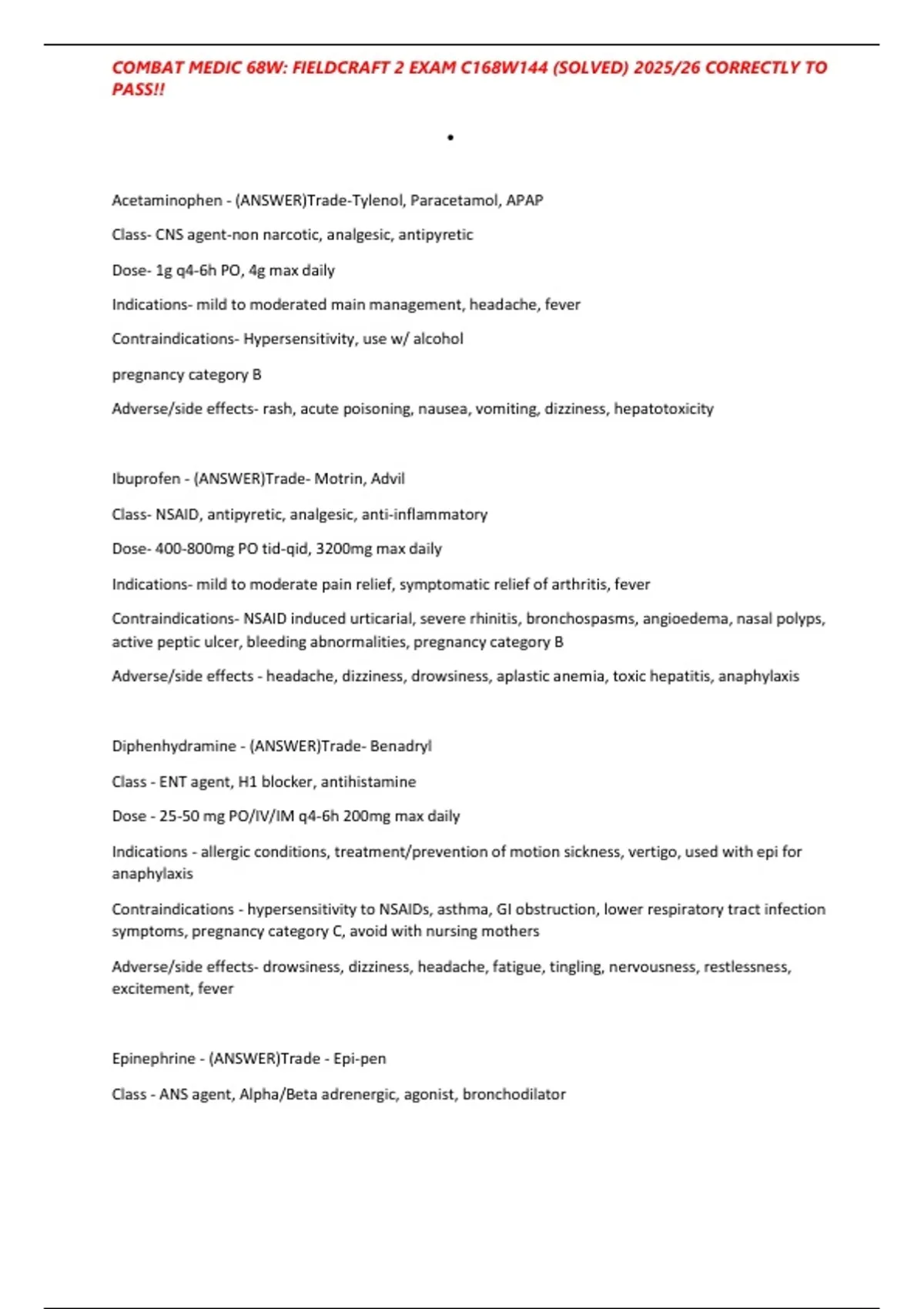, COMBAT MEDIC 68W: FIELDCRAFT 2 EXAM C168W144 (SOLVED) 2025/26 CORRECTLY TO