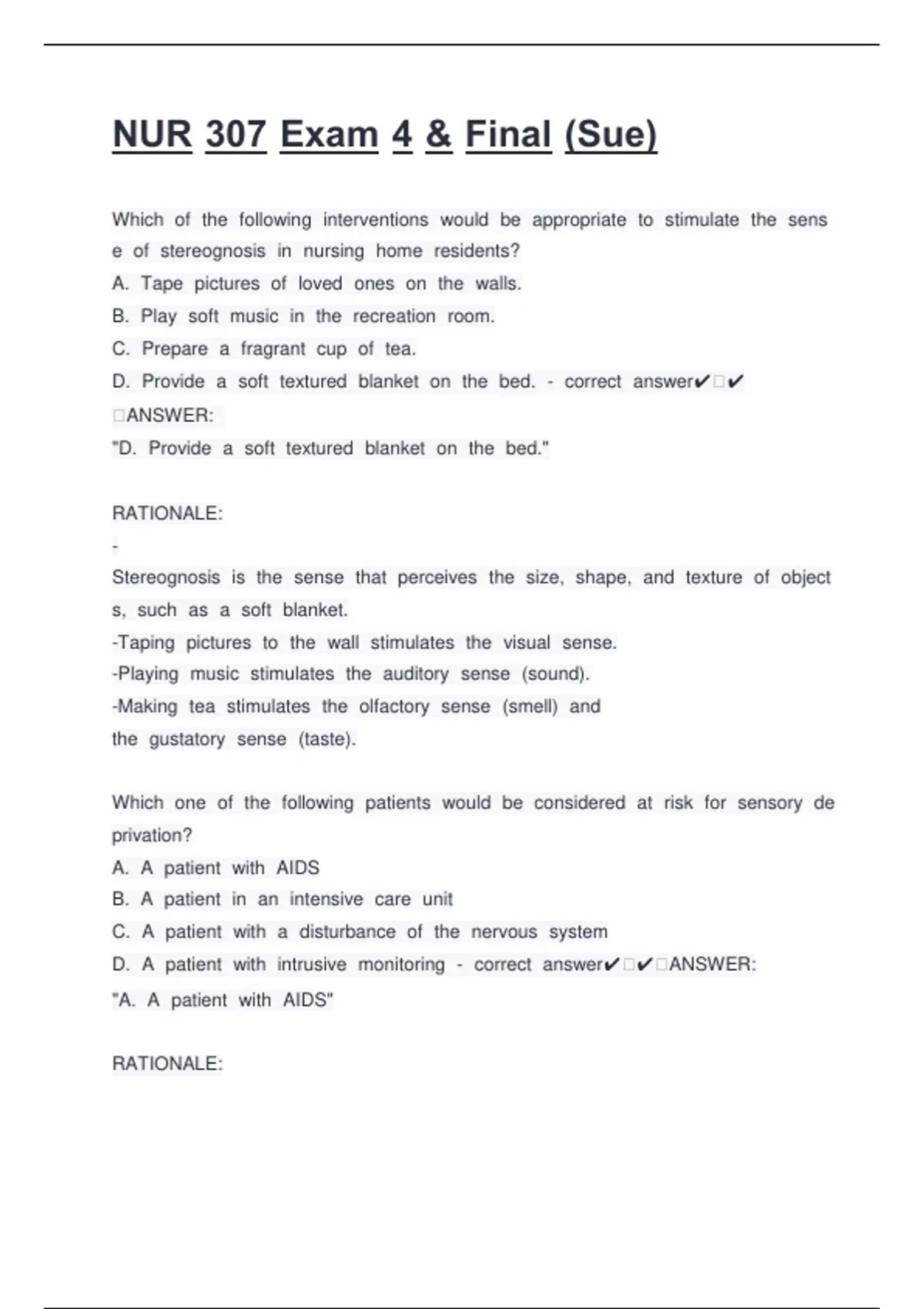 NUR 307 Exam 4 & Final (Sue)