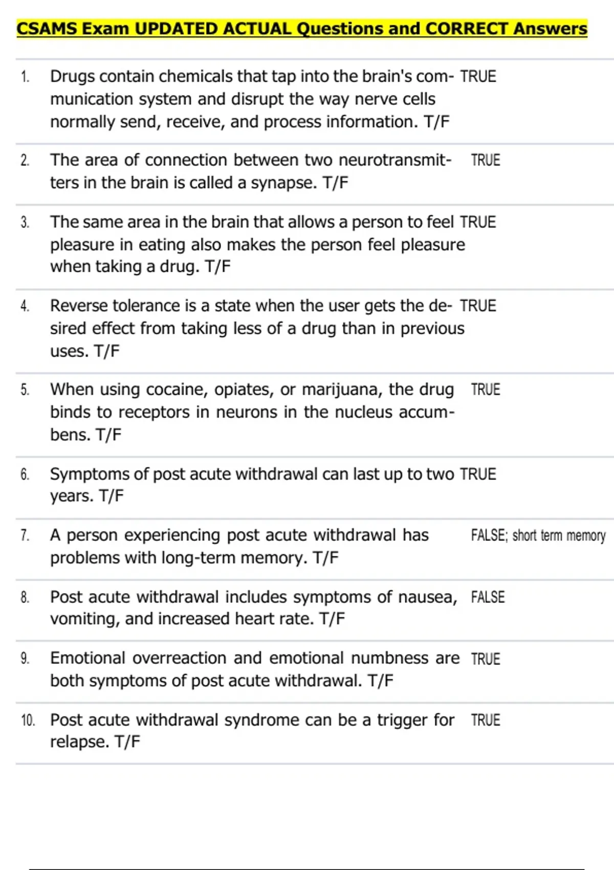 7. A person experiencing post acute withdrawal has FALSE; short term memory