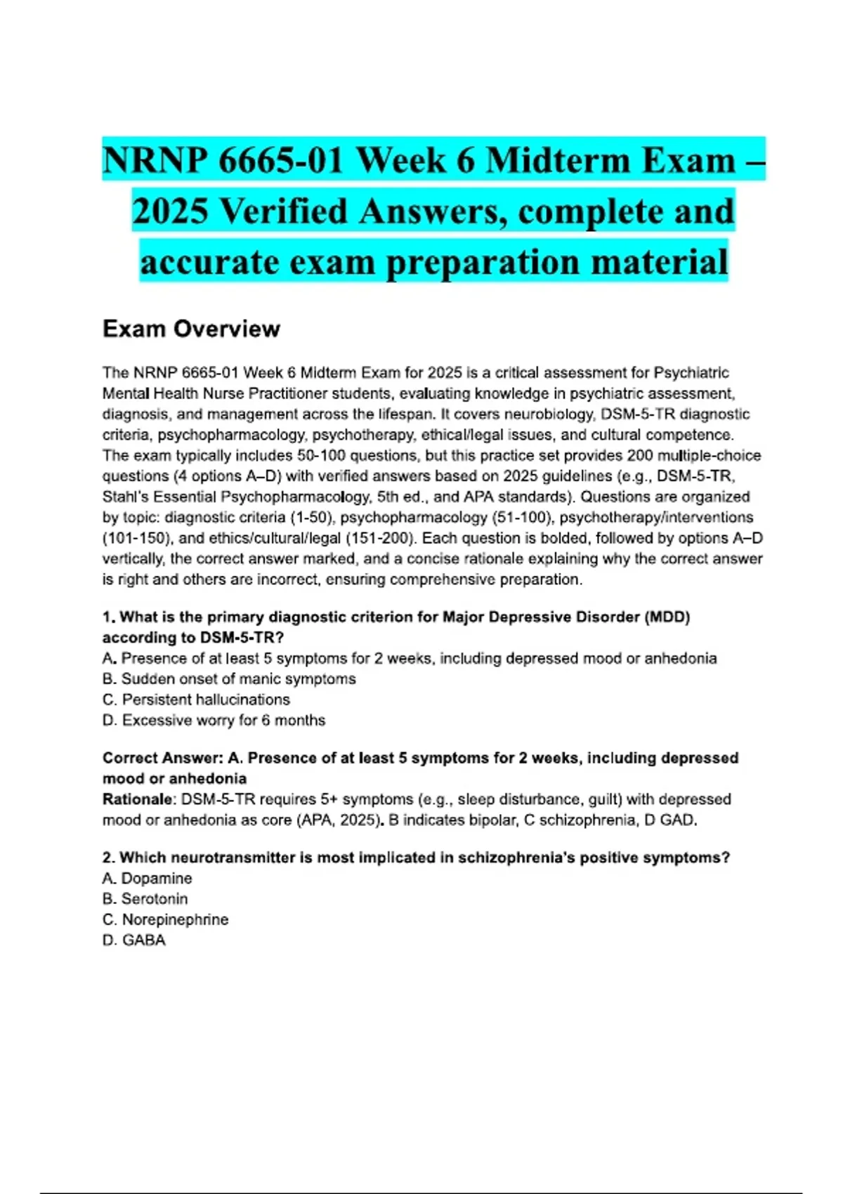 This document provides the NRNP 6665-01 Week 6 Midterm Exam with fully verified and up-to-date answers for the 2025 academic year. It covers essential topics in Psychotherapy With Individuals, including therapeutic modalities, treatment planning, case formulation, and evidence-based interventions. Designed to reflect the official exam format, this resource helps psychiatric-mental health nurse practitioner (PMHNP) students strengthen their knowledge and clinical reasoning for midterm success.