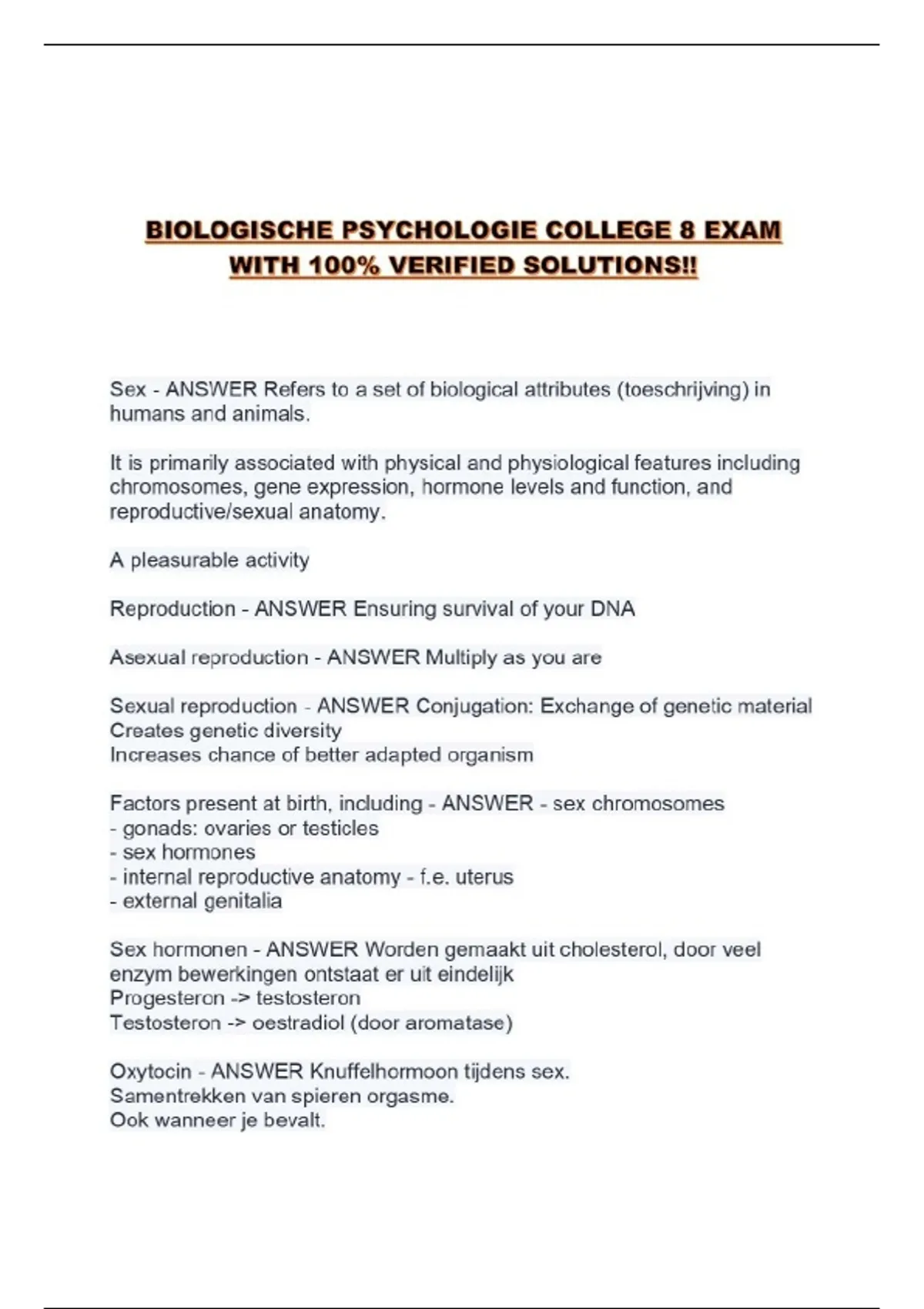 BIOLOGISCHE PSYCHOLOGIE COLLEGE 8 EXAM WITH 100% VERIFIED SOLUTIONS!!...
