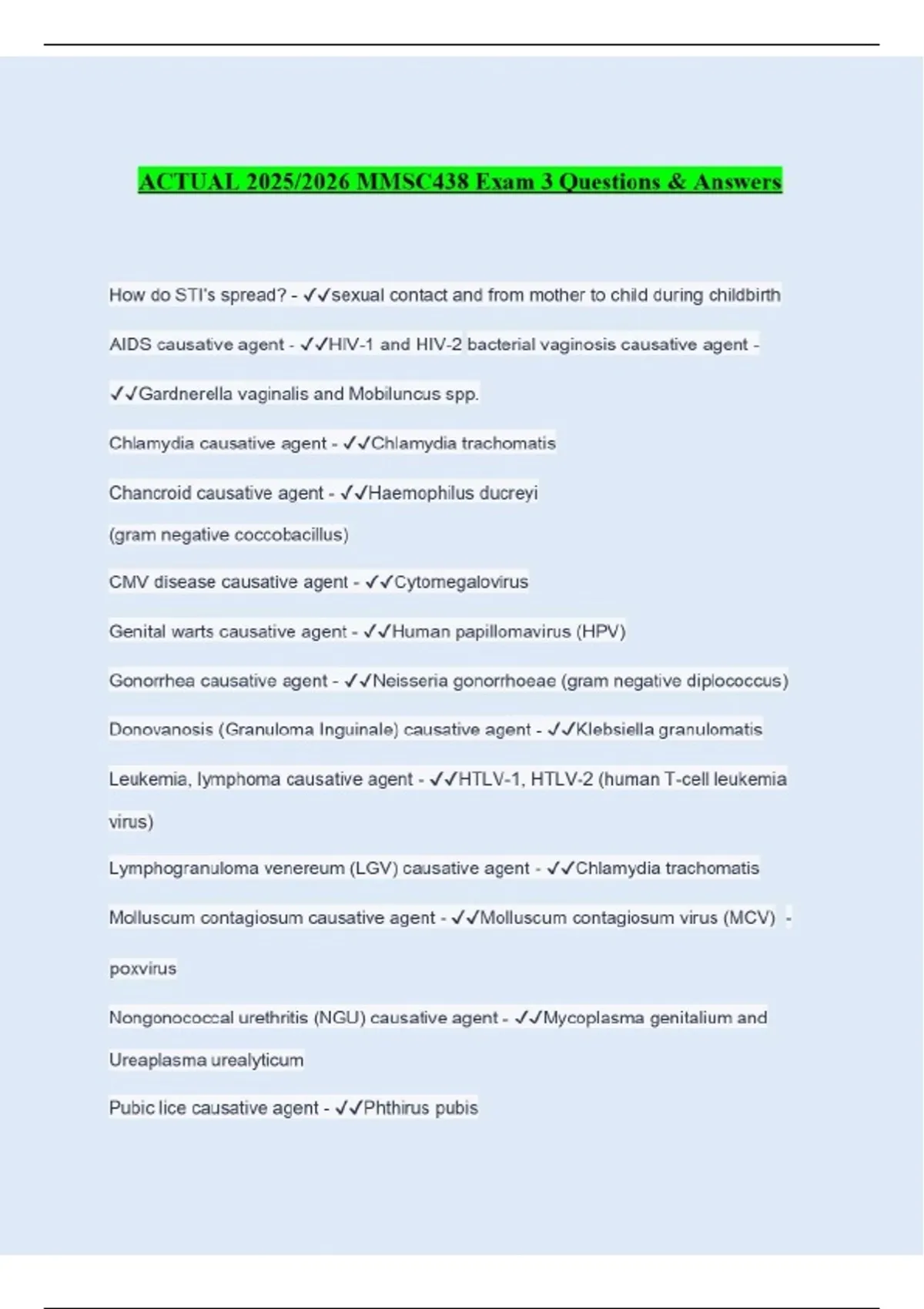 ACTUAL 2025/2026 MMSC438 Exam 3 Questions & Answers How do STI's spread? - ️️sexual contact and from mother to child during childbirth AIDS causative agent - ️️HIV-1 and HIV-2 bacterial vaginosis causative agent - ️️Gardnerella vaginalis and Mobiluncus spp. Chlamydia causative agent - ️️Chlamydia trachomatis Chancroid causative agent - ️️Haemophilus ducreyi (gram negative coccobacillus) CMV disease causative agent - ️️Cytomegalovirus Genital warts causative agent - ️️Human papillomavirus (HPV) Gonorrhea causative agent - ️️Neisseria gonorrhoeae (gram negative diplococcus) Donovanosis (Granuloma Inguinale) causative agent - ️️Klebsiella granulomatis Leukemia, lymphoma causative agent - ️️HTLV-1, HTLV-2 (human T-cell leukemia virus)