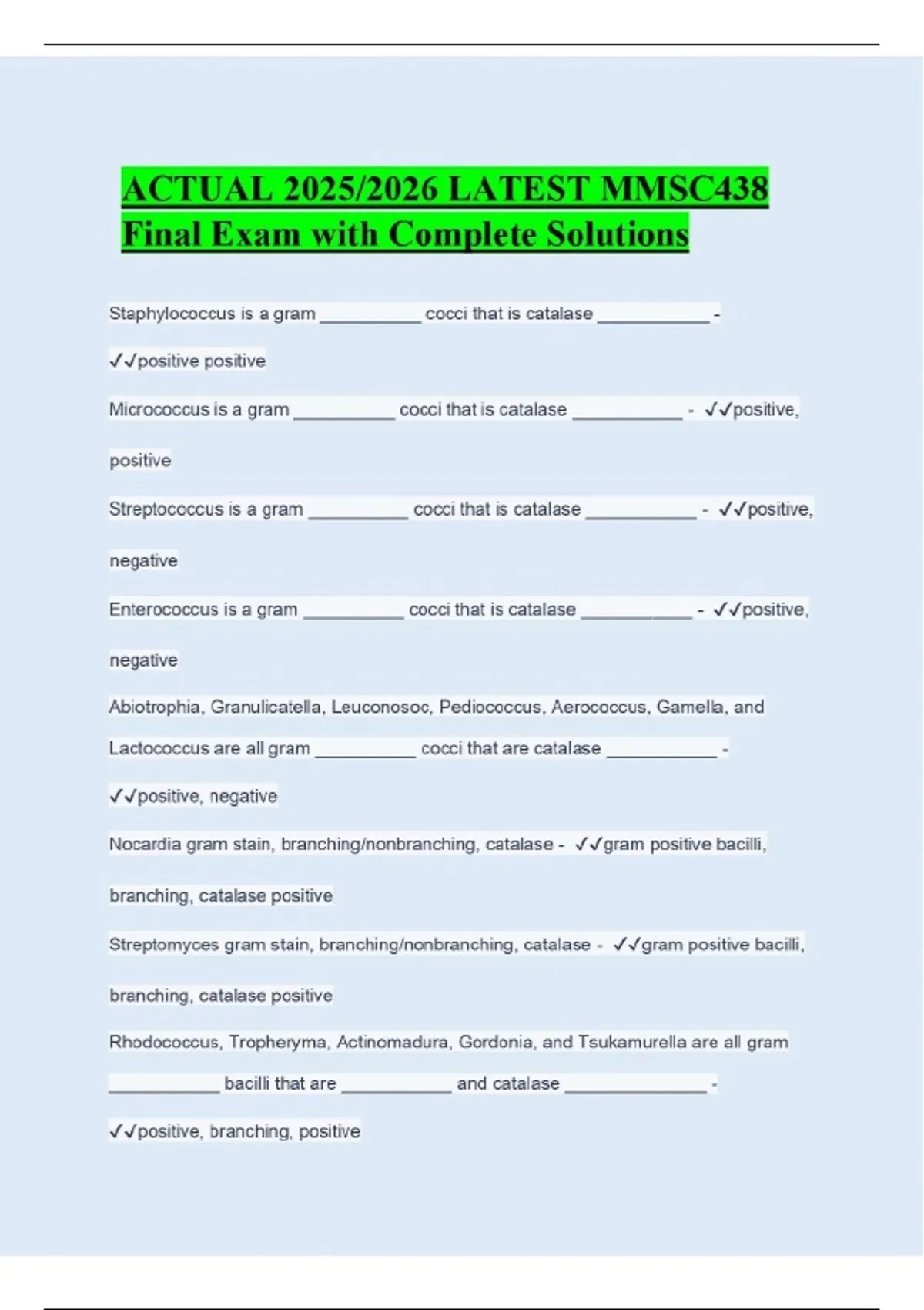 ACTUAL 2025/2026 LATEST MMSC438 Final Exam with Complete Solutions Staphylococcus is a gram __________ cocci that is catalase ___________ - ️️positive positive Micrococcus is a gram __________ cocci that is catalase ___________ - ️️positive, positive Streptococcus is a gram __________ cocci that is catalase ___________ - ️️positive, negative Enterococcus is a gram __________ cocci that is catalase ___________ - ️️positive, negative Abiotrophia, Granulicatella, Leuconosoc, Pediococcus, Aerococcus, Gamella, and Lactococcus are all gram __________ cocci that are catalase ___________ - ️️positive, negative Nocardia gram stain, branching/nonbranching, catalase - ️️gram positive bacilli, branching, catalase positive