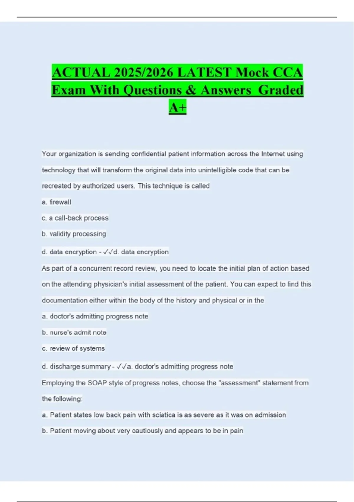 ACTUAL 2025/2026 LATEST Mock CCA Exam With Questions & Answers Graded A+ Your organization is sending confidential patient information across the Internet using technology that will transform the original data into unintelligible code that can be recreated by authorized users. This technique is called a. firewall c. a call-back process b. validity processing d. data encryption - d. data encryption As part of a concurrent record review, you need to locate the initial plan of action based on the attending physician's initial assessment of the patient. You can expect to find this documentation either within the body of the history and physical or in the a. doctor's admitting progress note b. nurse's admit note c. review of systems d. discharge summary - a. doctor's admitting progress note Employing the SOAP style of progress notes, choose the "assessment" statement from the following: