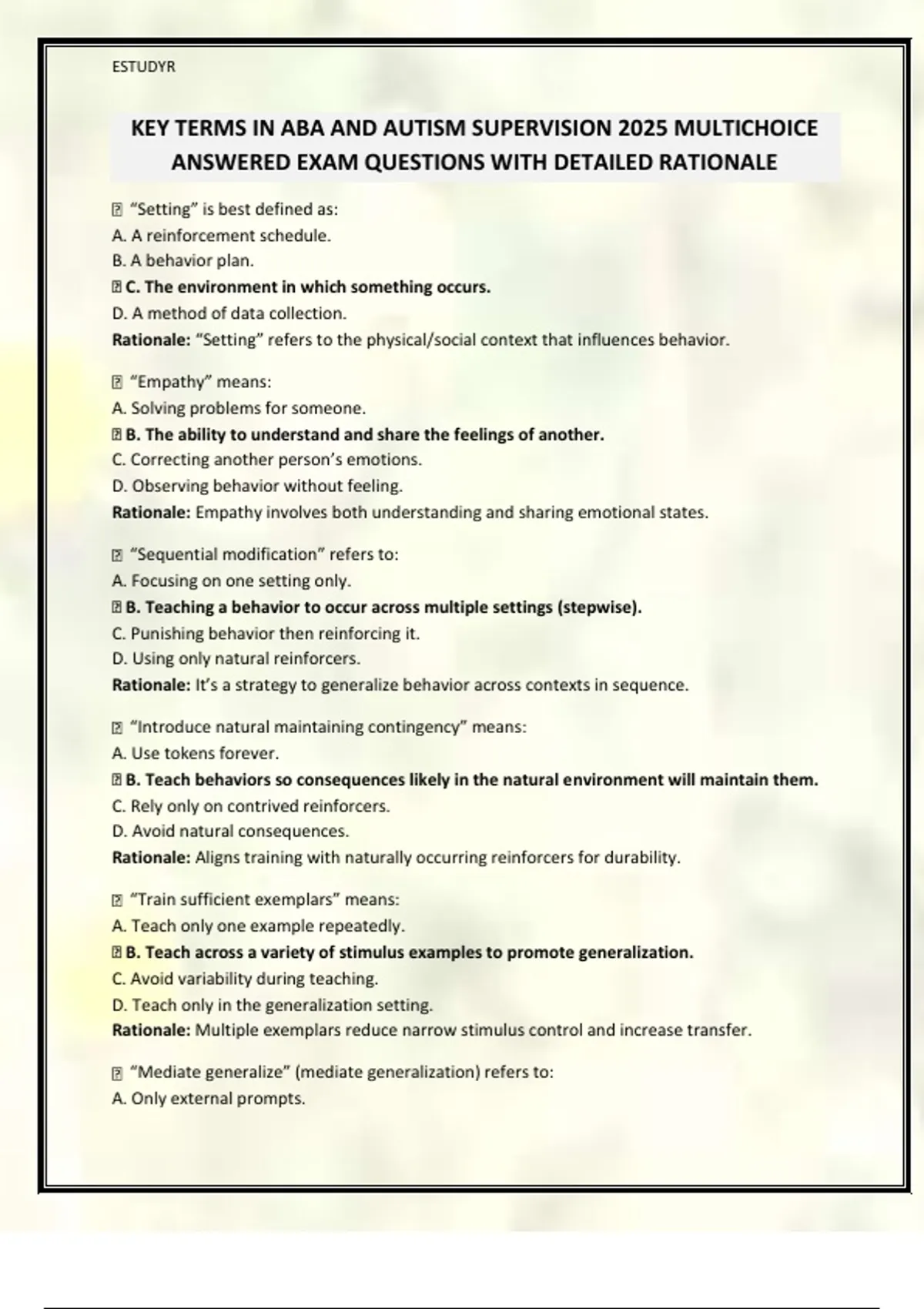 KEY TERMS IN ABA AND AUTISM SUPERVISION 2025 MULTICHOICE