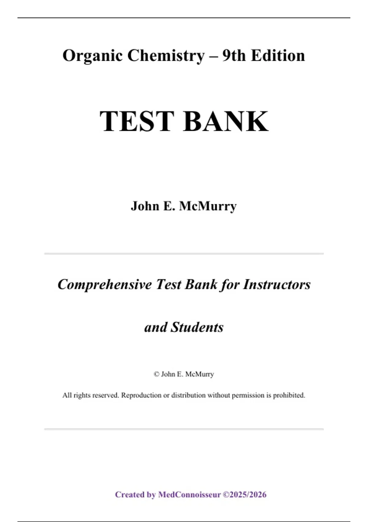 The Test Bank for Organic Chemistry, 9th Edition by John E. McMurry offers a fully verified suite of questions mapped precisely to the official Cengage edition. This resource includes multiple-choice, true/false, short-answer, and mechanism-based problems aligned with each chapter’s learning objectives, intended for quizzes, midterms, and final exams. All chapter titles below are verified from the official publisher’s Table of Contents and presented in continuous prose with bold formatting: Chapter 1: Structure and Bonding, Chapter 2: Polar Covalent Bonds; Acids and Bases, Chapter 3: Organic Compounds: Alkanes and Their Stereochemistry, Chapter 4: Organic Compounds: Cycloalkanes and Their Stereochemistry, Chapter 5: Stereochemistry at Tetrahedral Centers, Chapter 6: An Overview of Organic Reactions, Chapter 7: Alkenes: Structure and Reactivity, Chapter 8: Alkenes: Reactions and Synthesis, Chapter 9: Alkynes: An Introduction to Organic Synthesis, Chapter 10: Organohalides, Chapter 11: Reactions of Alkyl Halides: Nucleophilic Substitutions and Eliminations, Chapter 12: Structure Determination: Mass Spectrometry and Infrared Spectroscopy, Chapter 13: Structure Determination: Nuclear Magnetic Resonance Spectroscopy, Chapter 14: Conjugated Compounds and Ultraviolet Spectroscopy, Chapter 15: Benzene and Aromaticity, Chapter 16: Chemistry of Benzene: Electrophilic Aromatic Substitution, Chapter 17: Alcohols and Phenols, Chapter 18: Ethers and Epoxides; Thiols and Sulfides, Chapter 19: Aldehydes and Ketones: Nucleophilic Addition Reactions, Chapter 20: Carboxylic Acids and Nitriles, Chapter 21: Carboxylic Acid Derivatives: Nucleophilic Acyl Substitution Reactions, Chapter 22: Carbonyl Alpha-Substitution Reactions, Chapter 23: Carbonyl Condensation Reactions, Chapter 24: Amines and Heterocycles, Chapter 25: Biomolecules: Carbohydrates, Chapter 26: Biomolecules: Amino Acids, Peptides, and Proteins, Chapter 27: Biomolecules: Lipids, Chapter 28: Biomolecules: Nucleic Acids, Chapter 29: The Organic Chemistry of Metabolic Pathways, Chapter 30: Orbitals and Organic Chemistry: Pericyclic Reactions, Chapter 31: Synthetic Polymers.