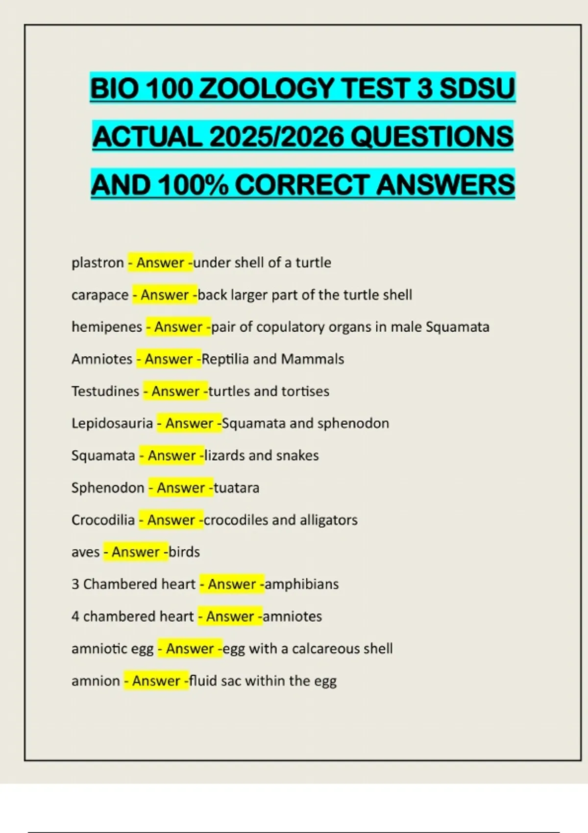 BIO 100 ZOOLOGY TEST 3 SDSU ACTUAL 2025/2026 QUESTIONS AND 100% CORRECT ANSWERS plastron - Answer -under shell of a turtle carapace - Answer -back larger part of the turtle shell hemipenes - Answer -pair of copulatory organs in male Squamata Amniotes - Answer -Reptilia and Mammals Testudines - Answer -turtles and tortises Lepidosauria - Answer -Squamata and sphenodon Squamata - Answer -lizards and snakes Sphenodon - Answer -tuatara Crocodilia - Answer -crocodiles and alligators aves - Answer -birds 3 Chambered heart - Answer -amphibians 4 chambered heart - Answer -amniotes amniotic egg - Answer -egg with a calcareous shell amnion - Answer -fluid sac within the egg