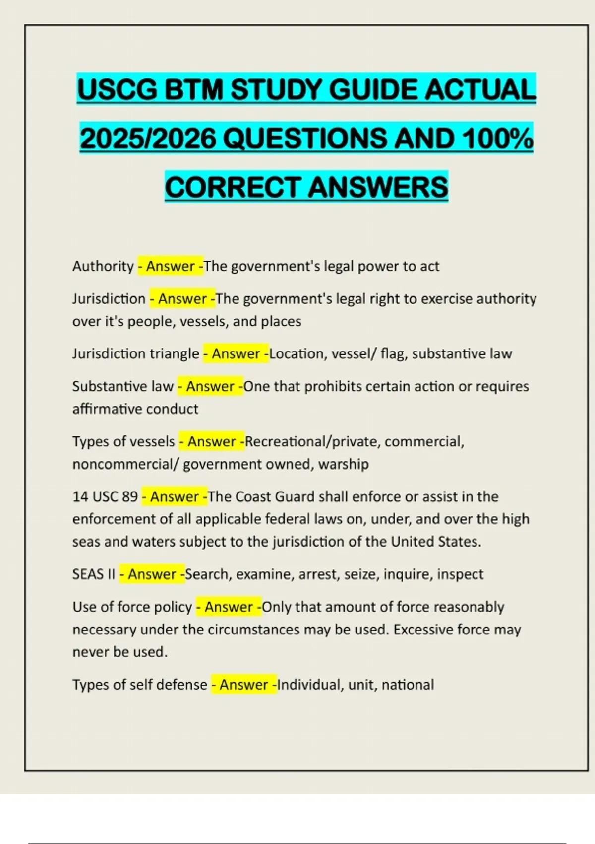 USCG BTM STUDY GUIDE ACTUAL 2025/2026 QUESTIONS AND 100% CORRECT ANSWERS Authority - Answer -The government's legal power to act Jurisdiction - Answer -The government's legal right to exercise authority over it's people, vessels, and places Jurisdiction triangle - Answer -Location, vessel/ flag, substantive law Substantive law - Answer -One that prohibits certain action or requires affirmative conduct Types of vessels - Answer -Recreational/private, commercial, noncommercial/ government owned, warship 14 USC 89 - Answer -The Coast Guard shall enforce or assist in the enforcement of all applicable federal laws on, under, and over the high seas and waters subject to the jurisdiction of the United States. SEAS II - Answer -Search, examine, arrest, seize, inquire, inspect Use of force policy - Answer -Only that amount of force reasonably necessary under the circumstances may be used. Excessive force may never be used. Types of self defense - Answer -Individual, unit, nationalUse of force continuum - Answer -Officer presence, verbal commands, control techniques, aggressive response techniques, intermediate weapons, deadly force Officer presence - Answer -Good uniform, blue light, boat, gun belt, attitude Verbal commands - Answer -Task direction, command/ consequence Control techniques - Answer -Has a low probability of causing connective tissue damage, lacerations, or broken bones. Normal application of handcuffs and pain compliance. Aggressive response techniques - Answer -Has a probability of causing connective tissue damage, lacerations, or broken bones. Irritation to the eyes skin and mucous membranes. Punches, kicks, stuns, OC pepper spray. Intermediate weapons - Answer -Have a high probability of causing connective tissue damage, lacerations, or broken bones. Expandable baton, less than lethal rounds Deadly force - Answer -Force that is likely to cause death or serious physical injury. Disfigurement broken bones unconsciousness. Four types of subjects - Answer -Passive compliant, passive resistor, active resistor, active aggressor Passive compliant subject -
