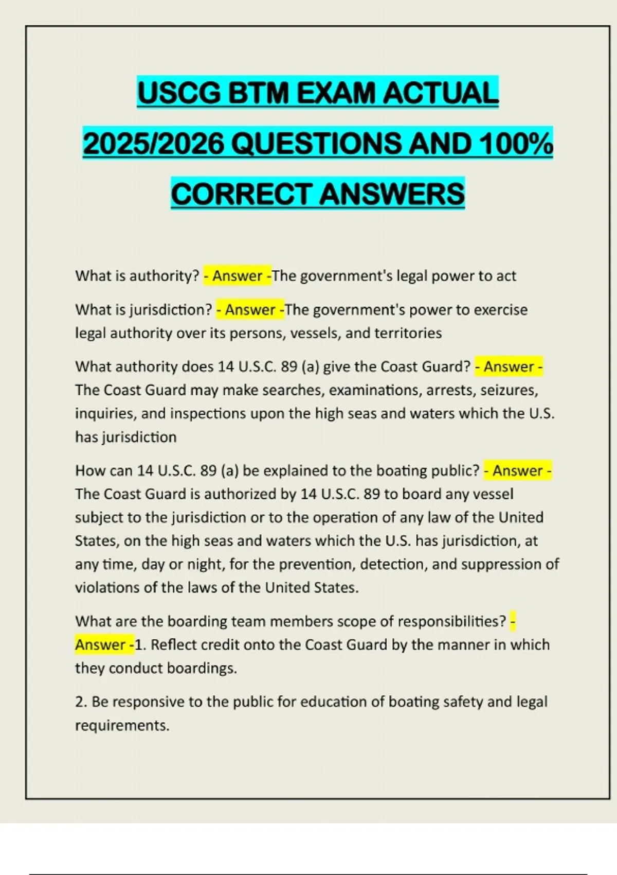 USCG BTM EXAM ACTUAL 2025/2026 QUESTIONS AND 100% CORRECT ANSWERS What is authority? - Answer -The government's legal power to act What is jurisdiction? - Answer -The government's power to exercise legal authority over its persons, vessels, and territories What authority does 14 U.S.C. 89 (a) give the Coast Guard? - Answer - The Coast Guard may make searches, examinations, arrests, seizures, inquiries, and inspections upon the high seas and waters which the U.S. has jurisdiction How can 14 U.S.C. 89 (a) be explained to the boating public? - Answer - The Coast Guard is authorized by 14 U.S.C. 89 to board any vessel subject to the jurisdiction or to the operation of any law of the United States, on the high seas and waters which the U.S. has jurisdiction, at any time, day or night, for the prevention, detection, and suppression of violations of the laws of the United States. What are the boarding team members scope of responsibilities? - Answer -1. Reflect credit onto the Coast Guard by the manner in which they conduct boardings. 2. Be responsive to the public for education of boating safety and legal requirements.3. Assist the boarding officer as necessary. What are the jurisdictional limitations (jurisdictional triangle)? - Answer -1. Substantive law (law that prohibits certain action or requires affirmative conduct). 2. Vessel status/flag 3. Location What is required for boardings of U.S. vessels in foreign territorial waters? - Answer -Coastal nation permission Foreign vessels temporarily using waters subject to U.S. jurisdiction are ___ from U.S. numbering and safety carriage requirements. - Answer - exempt Which vessels are not subject to U.S. jurisdiction? - Answer -Foreign government-owned non-commercial vessels, and foreign naval or military vessels Do units and personnel have a "duty to retreat" to avoid law enforcement situations? - Answer -No, however, retreat is an alternative and may be the most reasonable decision, depending upon the circumstances. What is non-deadly force? - Answer -Any force other than deadly force. What are the situations in which non-deadly force may be used? - Answer -1. Individual self-defense 2. To compel compliance with an order the Coast Guard has authority to issue3. To prevent a federal crime, or where authorized, a serious state or foreign crime for which the Coast Guard has authority to act on behalf of that state or foreign government 4. To affect a lawful arrest or prevent an escape when there is probable cause that the suspect committed a federal crime (or non-federal crime if lawfully acting under non-federal authority). 5. To prevent the theft of, intentional damage to, or destruction of property (including information) that the Coast Guard has authority to protect. What is the Use of Force Policy? - Answer -Only the force reasonably necessary under the circumstances may be used. Force shall not be