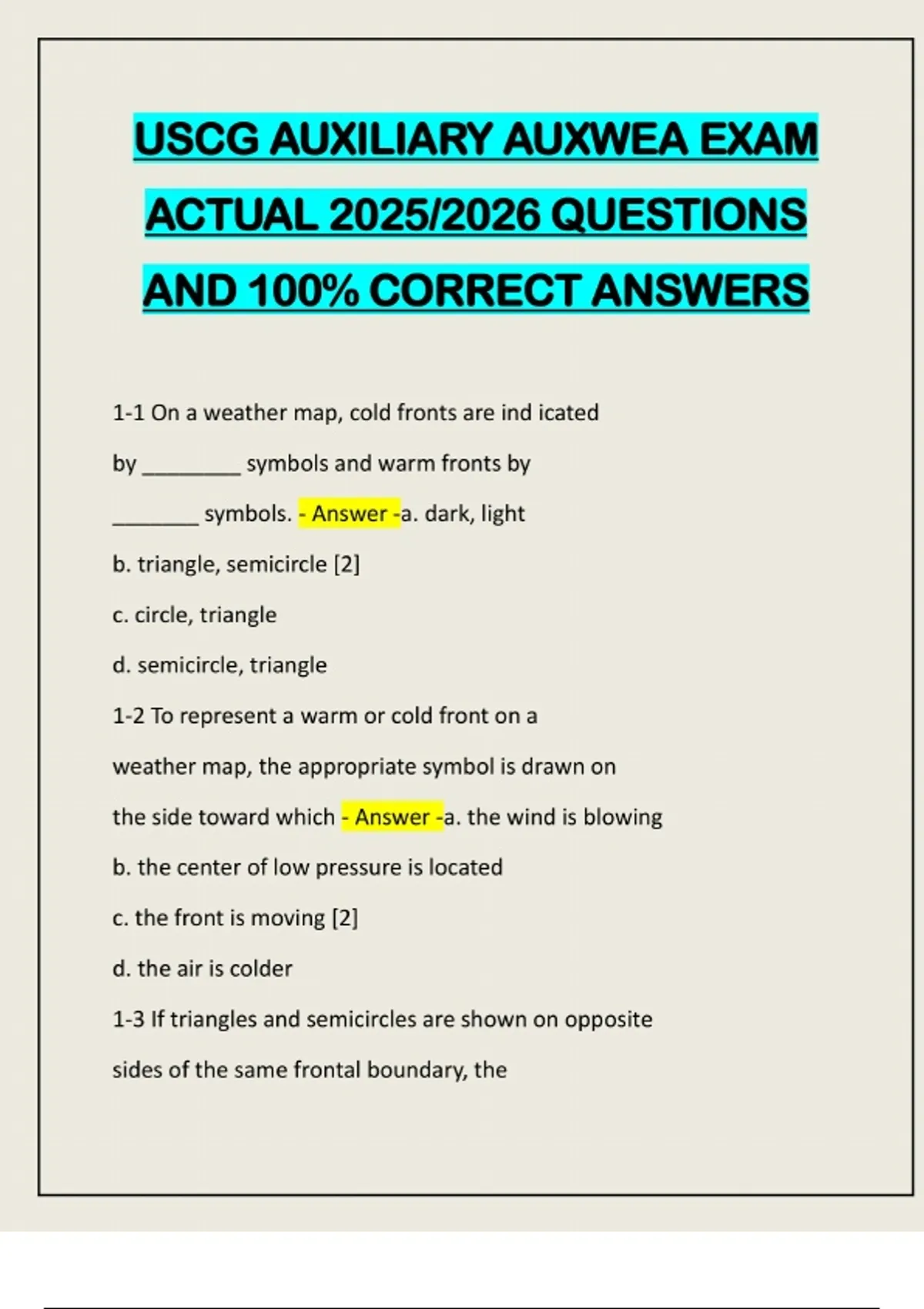 USCG AUXILIARY AUXWEA EXAM ACTUAL 2025/2026 QUESTIONS AND 100% CORRECT ANSWERS 1-1 On a weather map, cold fronts are ind icated by ________ symbols and warm fronts by _______ symbols. - Answer -a. dark, light b. triangle, semicircle [2] c. circle, triangle d. semicircle, triangle 1-2 To represent a warm or cold front on a weather map, the appropriate symbol is drawn on the side toward which - Answer -a. the wind is blowing b. the center of low pressure is located c. the front is moving [2] d. the air is colder 1-3 If triangles and semicircles are shown on opposite sides of the same frontal boundary, thefront is - Answer -a. cold b. occluded c. stationary [2] d. warm 1-4 Near a cold front, ______ air is advancing and replacing the ______ air on the other side. - Answer -a. cold, warm [2] b. cloudy, clear c. moist, dry d. windy, calm 1-5 The approach of deteriorating weather is indicated by a - Answer -a. falling hygrometer b. rising barometer c. falling barometer [3] d. falling speedometer 1-6 For best results, an outdoor thermometer should be - Answer -a. bought from a hardware store b. mounted in a shady spot [3] c. filled with colored water d. read on cloudy days1-7 Humidity is measured by an instrument called a/an - Answer -a. atomizer b. humidifier c. hygrometer [4] d. moisturizer 1-8 The amount of moisture actually in the air, as a _______ of what the air could contain, is called the _______ humidity. - Answer -a. ratio, measured b. percentage, relative [4] c. fraction, atmospheric d. percentage, partial 1-9 The maximum amount of moisture air can contain _______ as the air temperature ______. - Answer -a. decreases, decreases [4] b. increases, decreases c. decreases, increases d. stays the same, increases 1-10 Increasing wind speed is a sign that a _______ is _______ . - Answer -a. high, approaching b. front, departingc. front, approaching [4] d. low, receding 1-11 A north wind blows from the compass direction - Answer -a. 360 or 000 [4] b. 270 c. 180 d. 090 1-12 If the wind changes direction from 240 to 280 degrees, it is said to be - Answer -a. backing b. gusting c. turning d. veering [5] 1-13 You are facing NE, and the wind is at your back. According to the Buys Ballot rule,