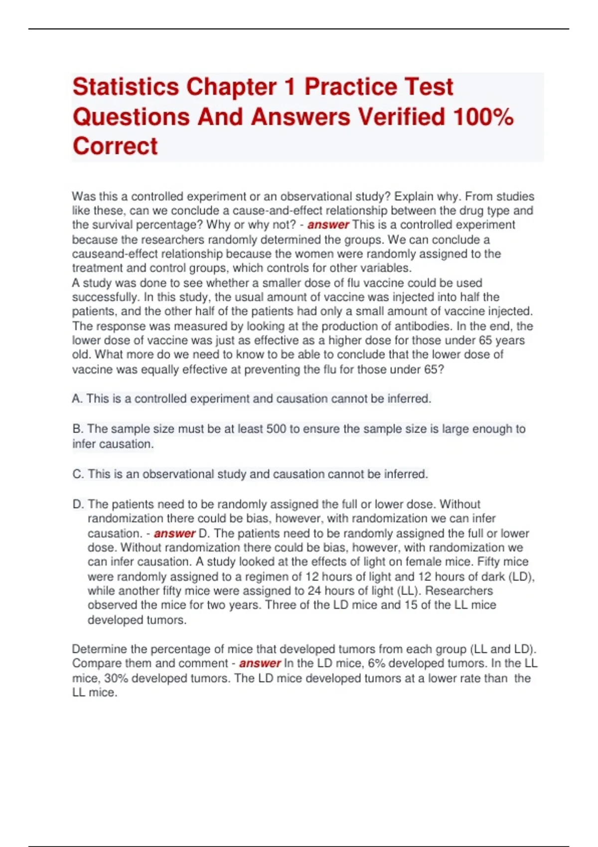 Statistics Chapter 1 Practice Test Questions And Answers Verified 100% Correct Was this a controlled experiment or an observational study? Explain why. From studies like these, can we conclude a cause-and-effect relationship between the drug type and the survival percentage? Why or why not? - answer This is a controlled experiment because the researchers randomly determined the groups. We can conclude a causeand-effect relationship because the women were randomly assigned to the treatment and control groups, which controls for other variables. A study was done to see whether a smaller dose of flu vaccine could be used successfully. In this study, the usual amount of vaccine was injected into half the patients, and the other half of the patients had only a small amount of vaccine injected. The response was measured by looking at the production of antibodies. In the end, the lower dose of vaccine was just as effective as a higher dose for those under 65 years old. What more do we need to know to be able to conclude that the lower dose of vaccine was equally effective at preventing the flu for those under 65? A. This is a controlled experiment and causation cannot be inferred. B. The sample size must be at least 500 to ensure the sample size is large enough to infer causation. C. This is an observational study and causation cannot be inferred. D. The patients need to be randomly assigned the full or lower dose. Without randomization there could be bias, however, with randomization we can infer causation. - answer D. The patients need to be randomly assigned the full or lower dose. Without randomization there could be bias, however, with randomization we can infer causation. A study looked at the effects of light on female mice. Fifty mice were randomly assigned to a regimen of 12 hours of light and 12 hours of dark (LD), while another fifty mice were assigned to 24 hours of light (LL). Researchers observed the mice for two years. Three of the LD mice and 15 of the LL mice developed tumors. Determine the percentage of mice that developed tumors from each group (LL and LD). Compare them and comment - answer In the LD mice, 6% developed tumors. In the LL mice, 30% developed tumors. The LD mice developed tumors at a lower rate than the LL mice. A study looked at the effects of light on female mice. Fifty mice were randomly assigned to a regimen of 12 hours of light and 12 hours of dark (LD), while another fifty mice were assigned to 24 hours of light (LL). Researchers observed the mice for two years. Three of the LD mice and 15 of the LL mice developed tumors. Was this a controlled experiment or an observational study? How do you know? - answer This was a controlled experiment because there were two groups that were assigned by the researchers. A study looked at the effects of light on female mice. Fifty mice were randomly assigned to a regimen of 12 hours of light and 12 hours of dark (LD), while another fifty mice were assigned to 24 hours of light (LL). Researchers observed the mice for two years. Three of the LD mice and 15 of the LL mice developed tumors. Can we conclude that light for 24 hours a day causes an increase in tumors in mice? Why or why not? - answer Because it was a controlled experiment, it can be concluded that light for 24 hours a day causes an increase in tumors in mice. Questions about causality are usually phrased in the form of ___ questions. - answer Questions about causality are usually phrased in the form of "What if...?" questions. The outcome variable in a question about causality is also referred to as what? - answer The response variable In an experiment studying the association between a treatment variable and an outcome variable, the group of people who do NOT receive the treatment are called what? - answer The control group Of the following, which is the only method of data collection suitable for making conclusions about causal relationships? - answer Controlled experiments Which of the following is an identifying mark of an observational study? - answer Subjects in the study are put into the treatment group or the control group either by their own actions or by the decision of someone not involved in the research study. A difference between two groups in an observational study that can explain why the outcomes were very different between the groups is called what? - answer A confounding variable Which of the following is a reason we can never draw cause-and-effect conclusions from observational studies? - answer Potential confounding variables may explain the differences between groups rather than the treatment variable. Why is random assignment used to assign people to treatment groups and control groups in a controlled experiment? - answer To make the groups as similar as possible, minimizing bias. Which of the following is NOT one of the criteria for the "gold standard" for experiments? - answer Equal sample sizes for control and treatment group The study of statistics rests on what two major concepts? - answer Variation and data The circles shown to the right are similar, but not exactly the same. This is an example of _______. - answer The circles shown to the right are similar, but not exactly the same. This is an example of variation. Data are more than just numbers, because data have _____. - answer Data are more than just numbers, because data have context. In statistics, variables are _____. - answer In statistics, variables are characteristics of people or things. In statistics, the data we work with is just one part of a bigger picture called the ____. - answer In statistics, the data we work with is just one part of a bigger picture called the population. Which of the following questions should be asked when developing an understanding of data? A. Who collected the data? B. What variables were measured? C. How were the variables measured? D. All of these questions are important. - answer All of these questions are important. What are two basic t